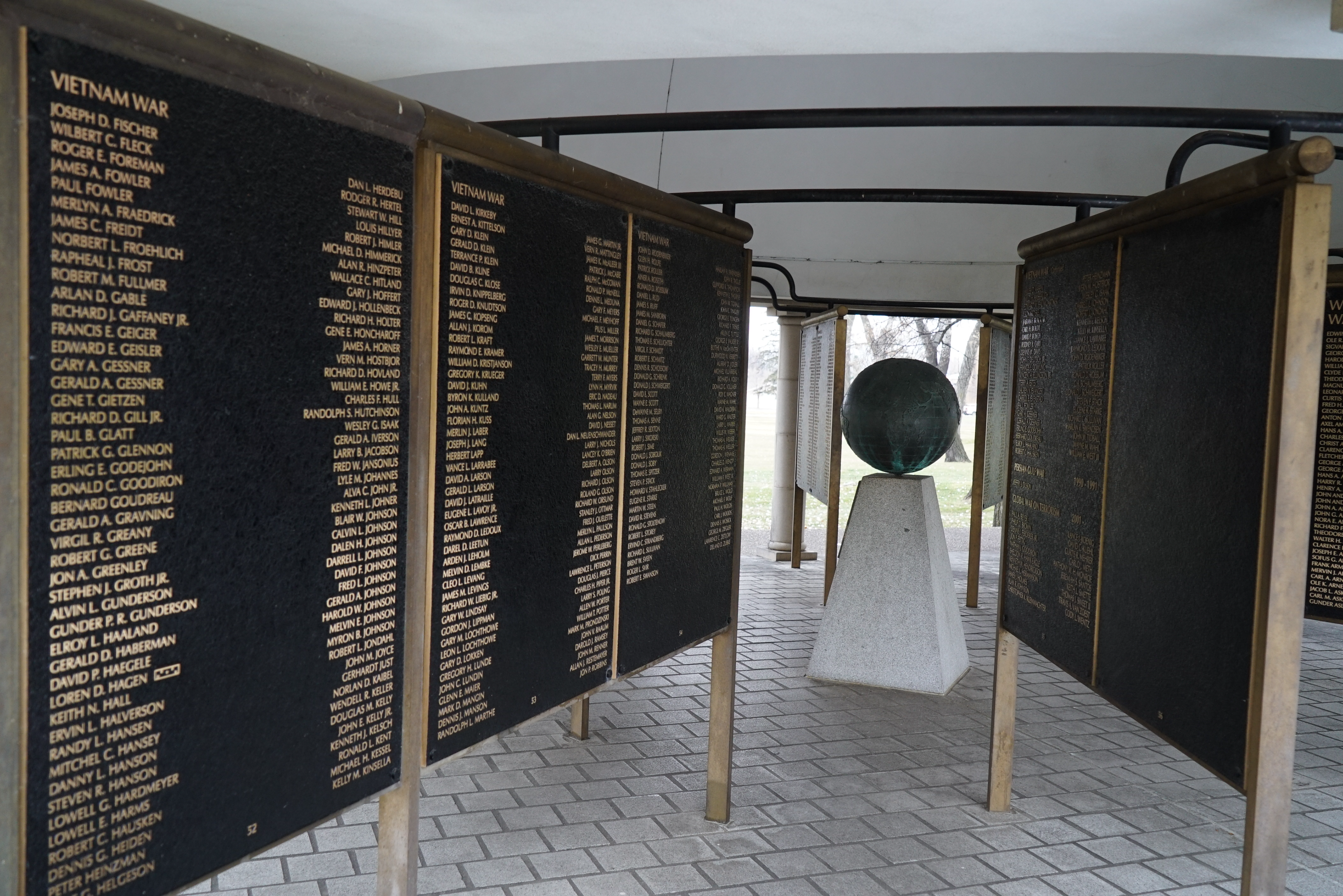 A look within the All Veterans Memorial depicts a globe and panels featuring names of North Dakota Veterans who paid the ultimate price during their military service, Nov. 9, 2022, Bismarck, N.D.