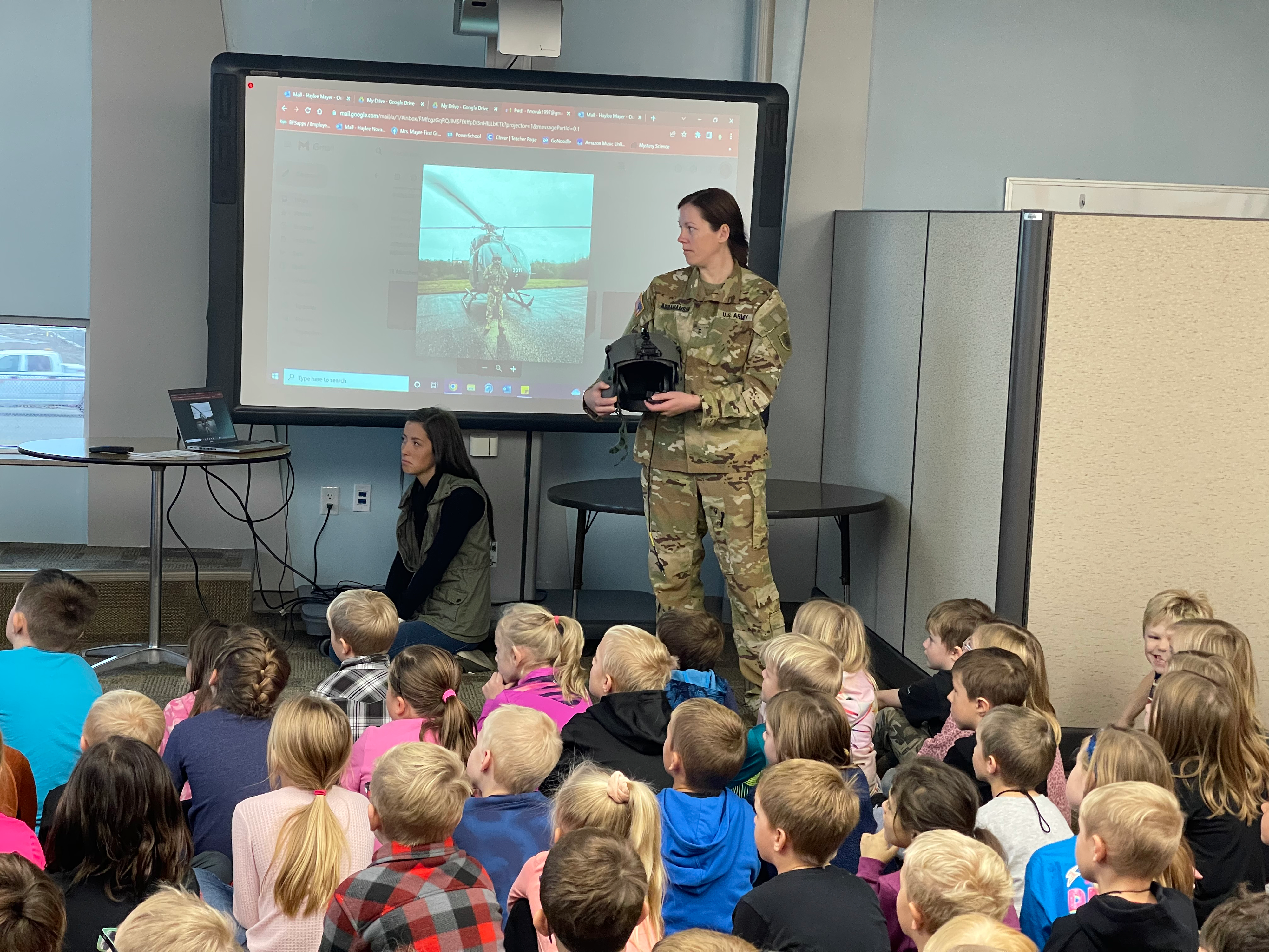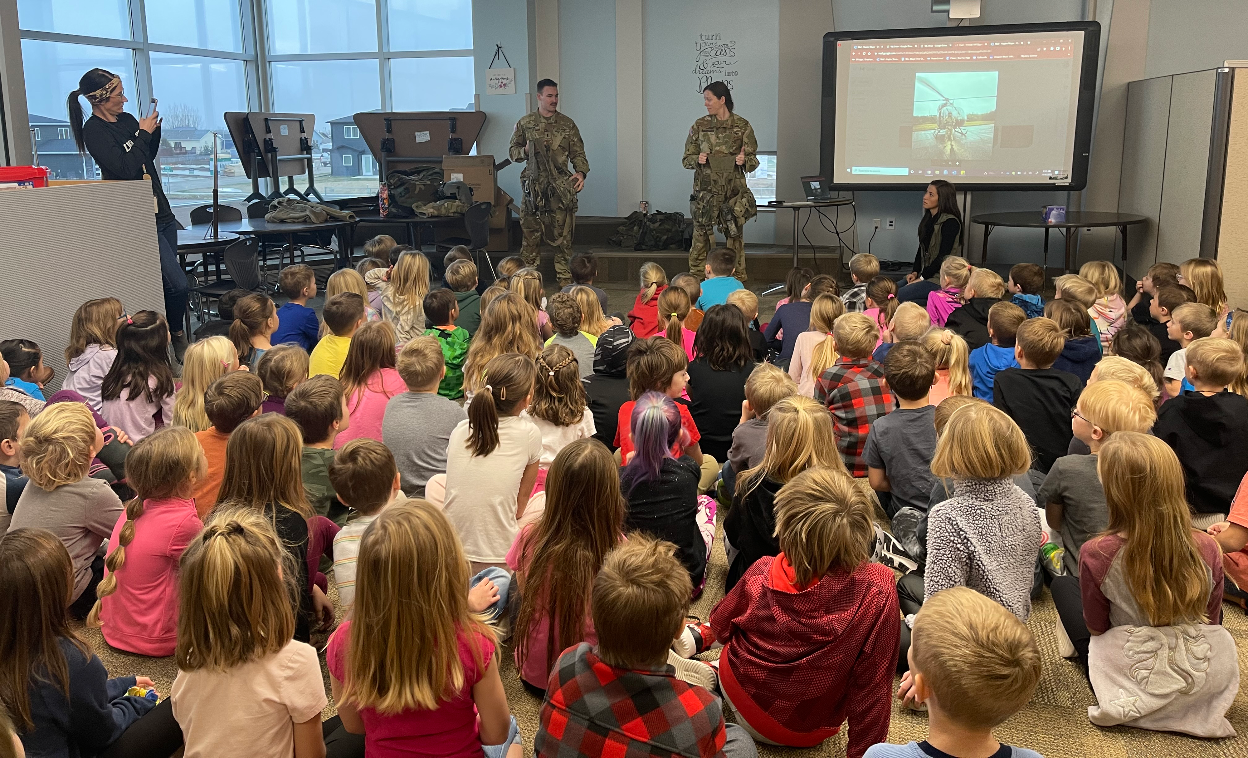 1st Lt. Justin Mayer along with Chief Warrant Officer 2 Tami Abrahamson, both of Company C, 2nd Battalion, 285th Aviation Regiment, and Sgt. Maari Beck, 1st Battalion, 112th Aviation Regiment discussed various aspects of Army aviation with about 120 first grade children.