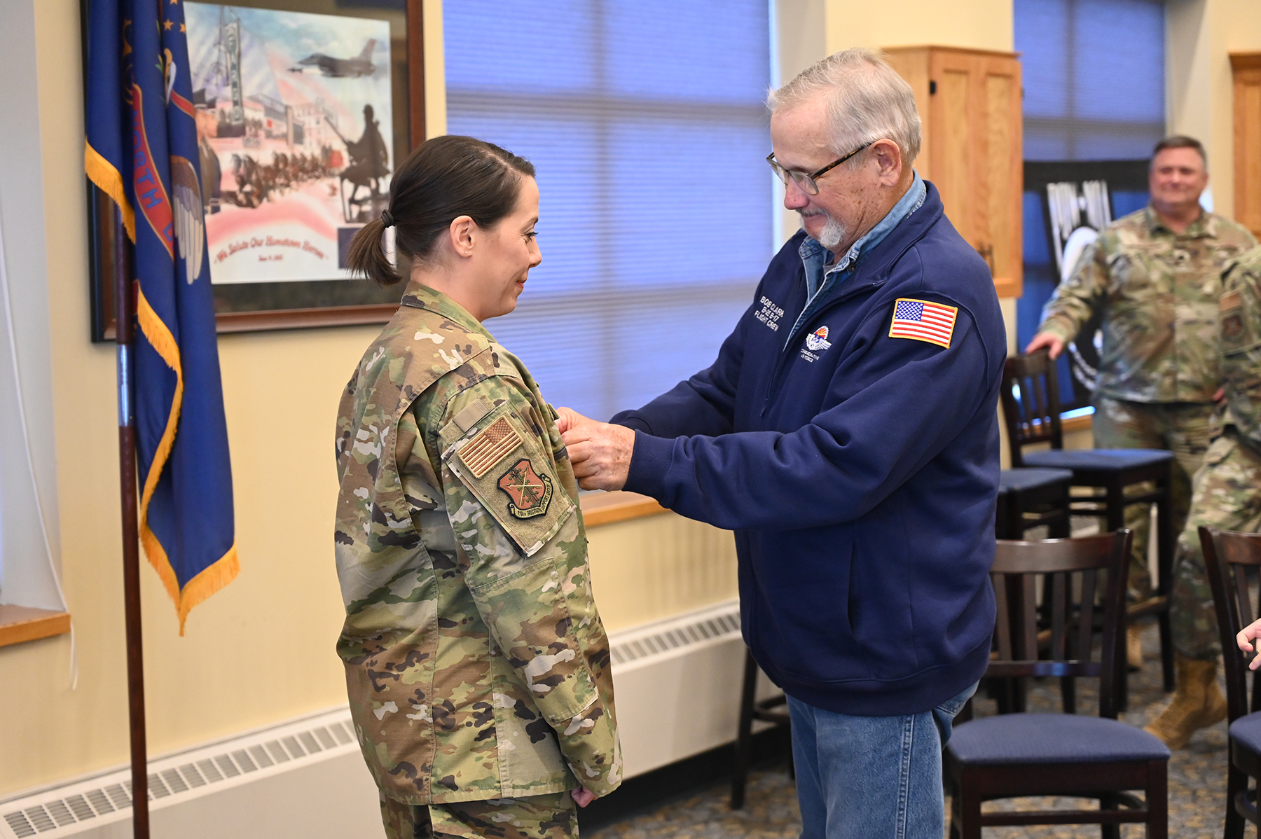 Kari Appletoft was promoted to chief master sergeant at the N.D. Air National Guard Base, Fargo, N.D., Nov. 5, 2022. Her father, Retired Chief Master Sgt. Robert Clarke affixed her new rank to her uniform during the ceremony.