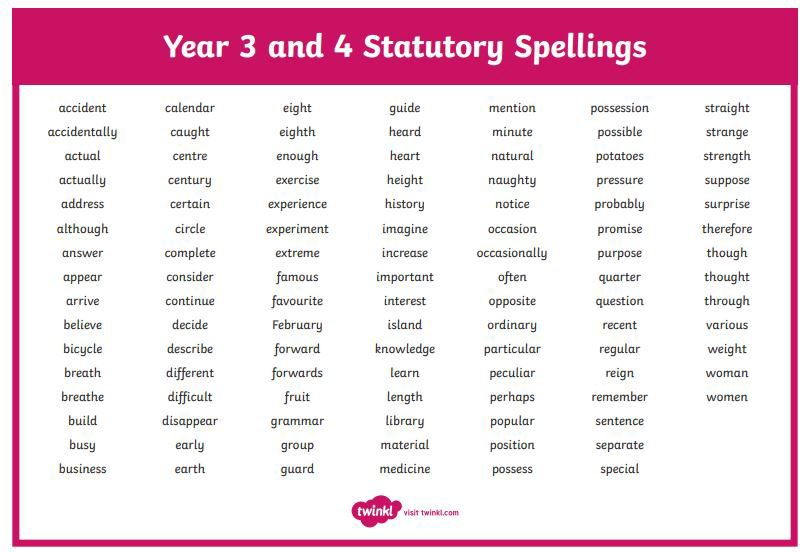 Each week your child will bring home a set of spellings to learn. This will include the week's spelling rule (usually related to phonics) and Statutory Words for Year 3 and 4.