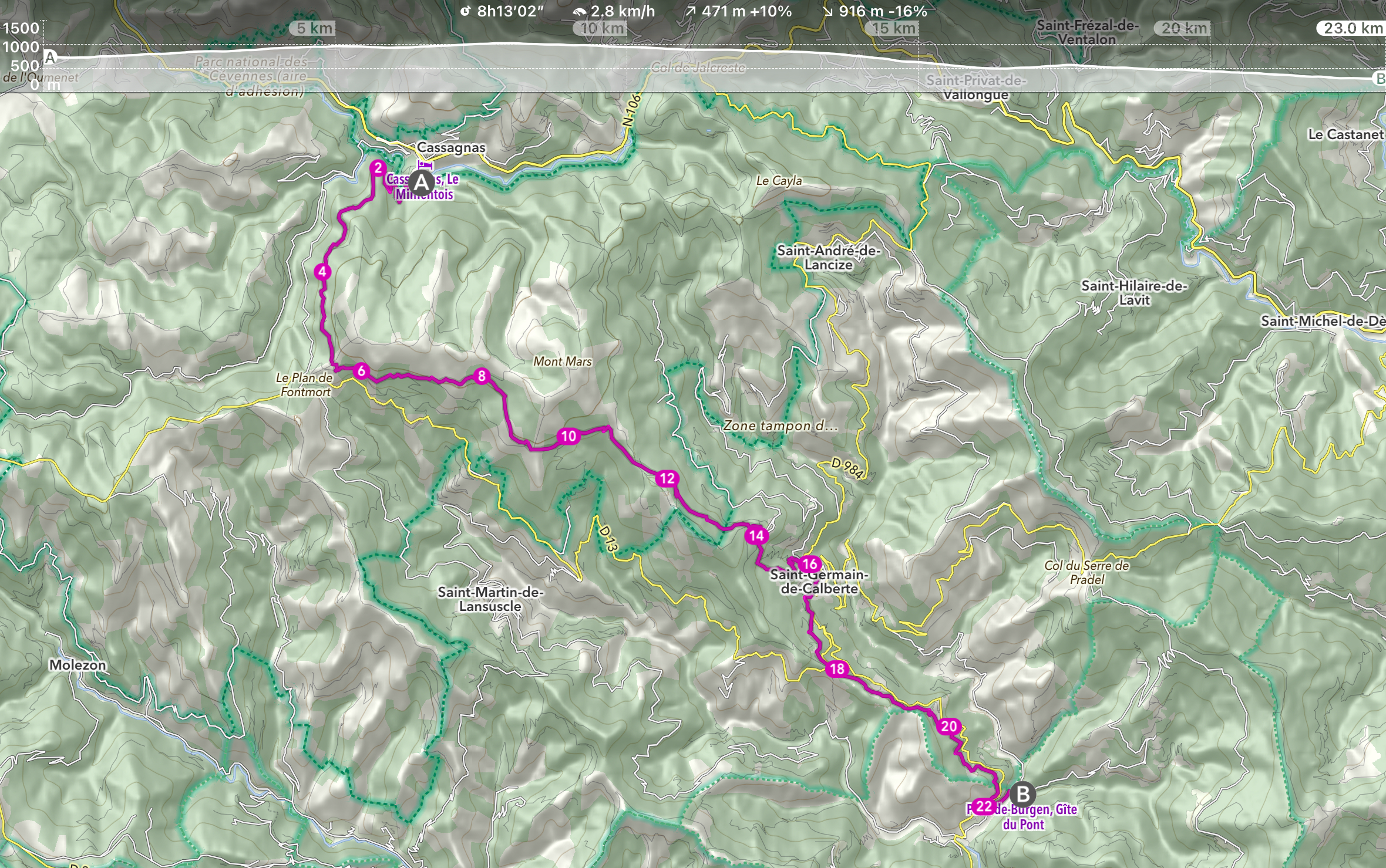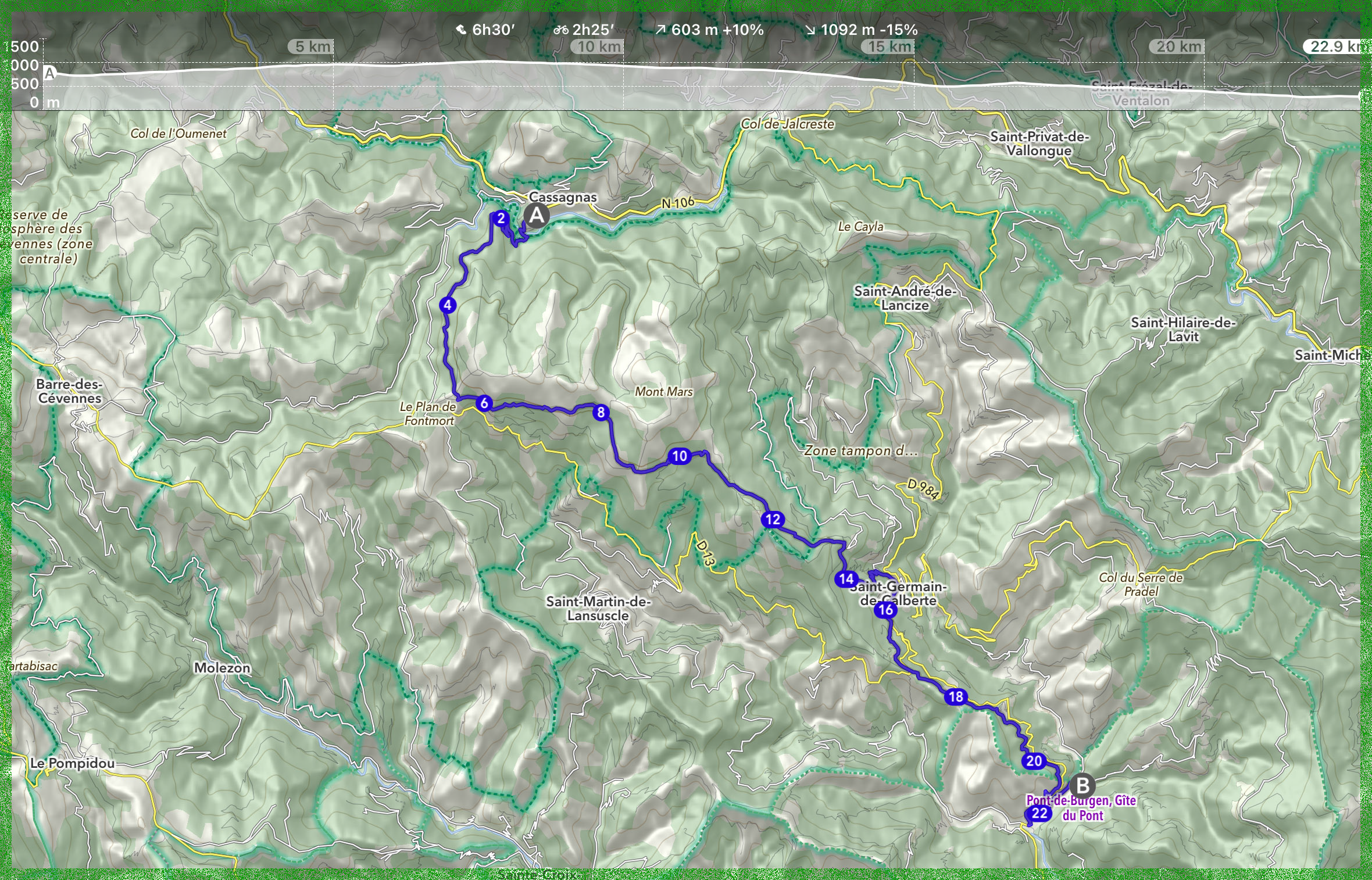 Le parcours prévu : Cassagnas > Pont-de-Burgen, 22,9 km