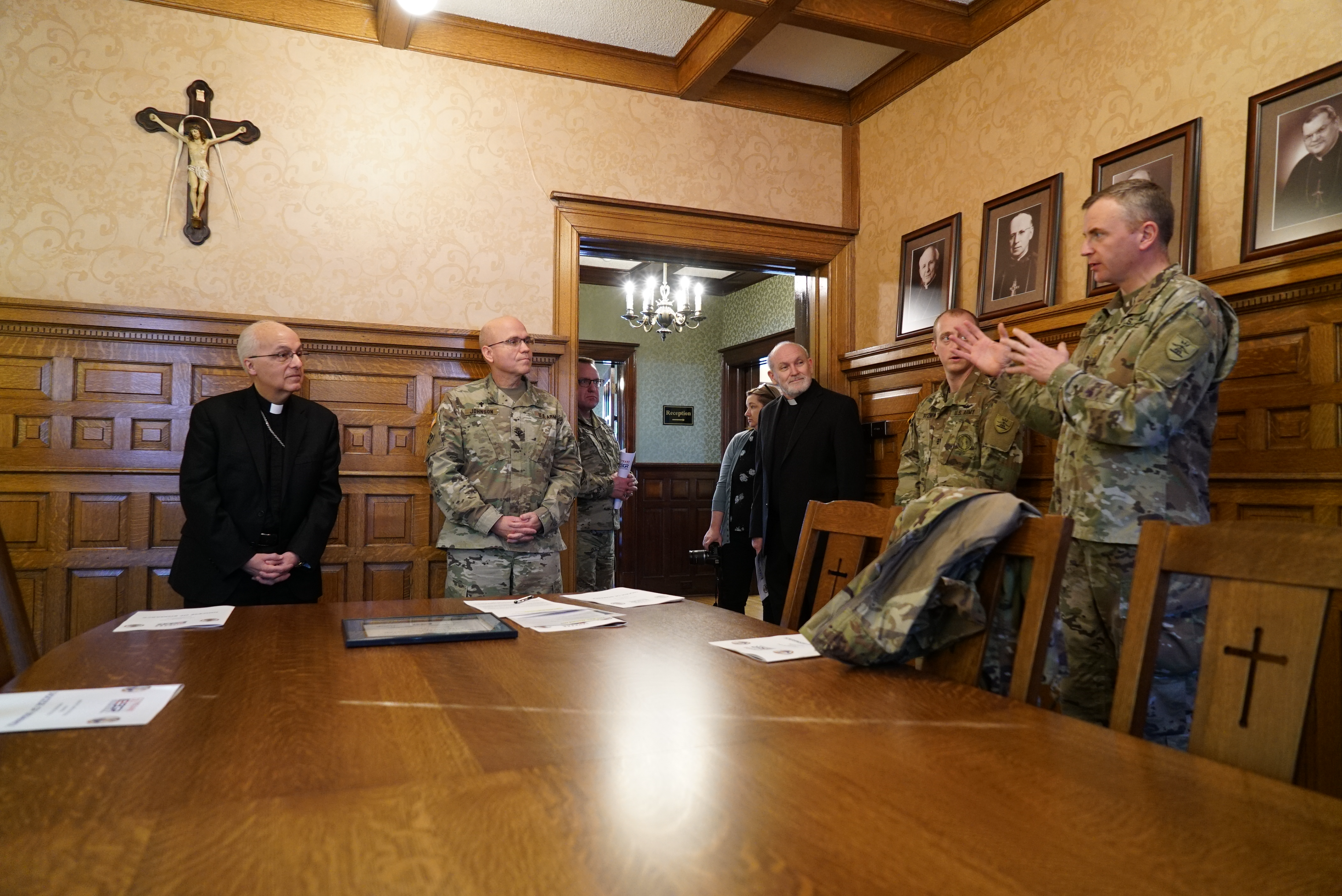 Rob Keller, ESGR, left, and Bishop David Kagan, Diocese of Bismarck, listen to Chaplain (Col.) David Johnson, N.D. Guard state chaplain, discuss the high level of support the Diocese provides the N.D. National Guard, Bismarck, March 15, 2022.