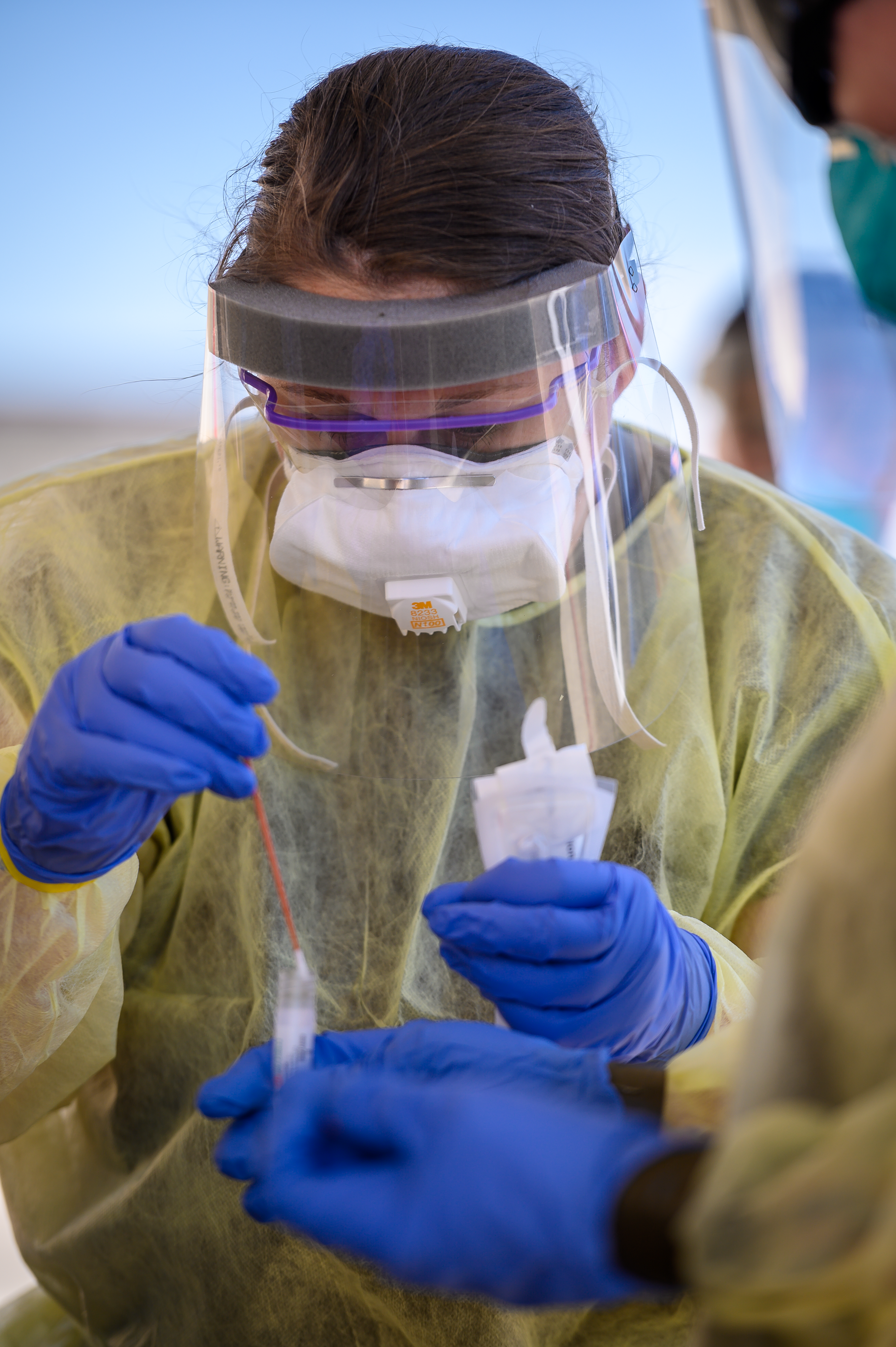 Spc. Miranda Iverz, 1st Battalion, 188th Air Defense Artillery Regiment, administers a COVID-19 test at the mobile testing site at Spirit Lake Casino and Resort in St. Michael, N.D., June 11, 2020. (National Guard photo by Sgt. 1st Class Brett Miller, 116th Public Affairs Detachment)