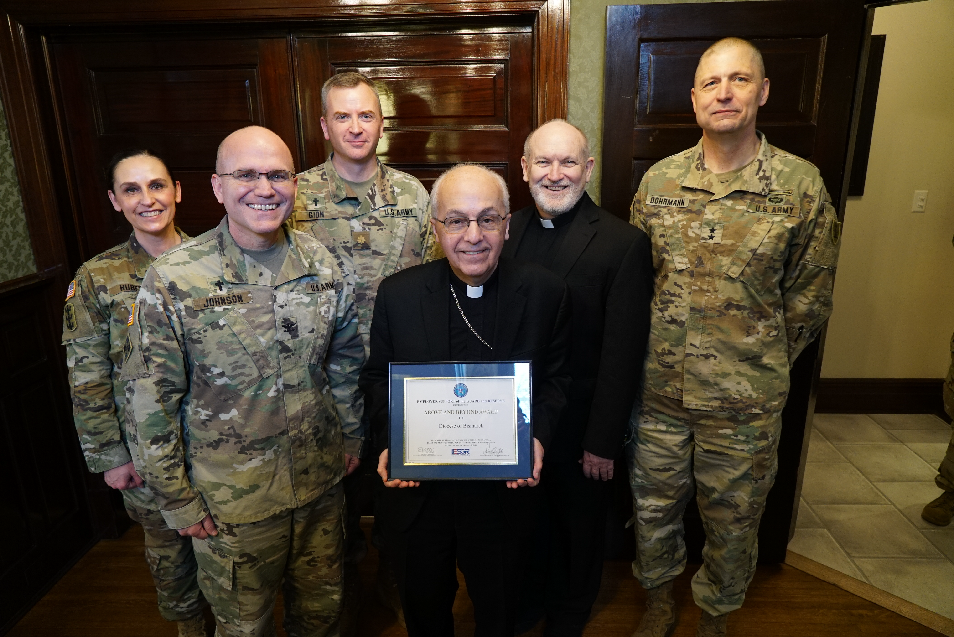 The Diocese of Bismarck received the Employer Support of the Guard and Reserve Award (ESGR) “Above and Beyond Award" in Bismarck, March 15, 2022. (National Guard story and photos by Sgt. 1st Class Charles Highland, N.D. National Guard Public Affairs)