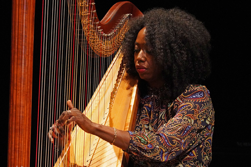 Residency activities included class visits across the School of Music, Theatre & Dance, a visit to Cass Tech High School’s harp program in Detroit (where Alice Coltrane was born), and several public-facing events including a lecture and performance with the Brandee Younger Trio.