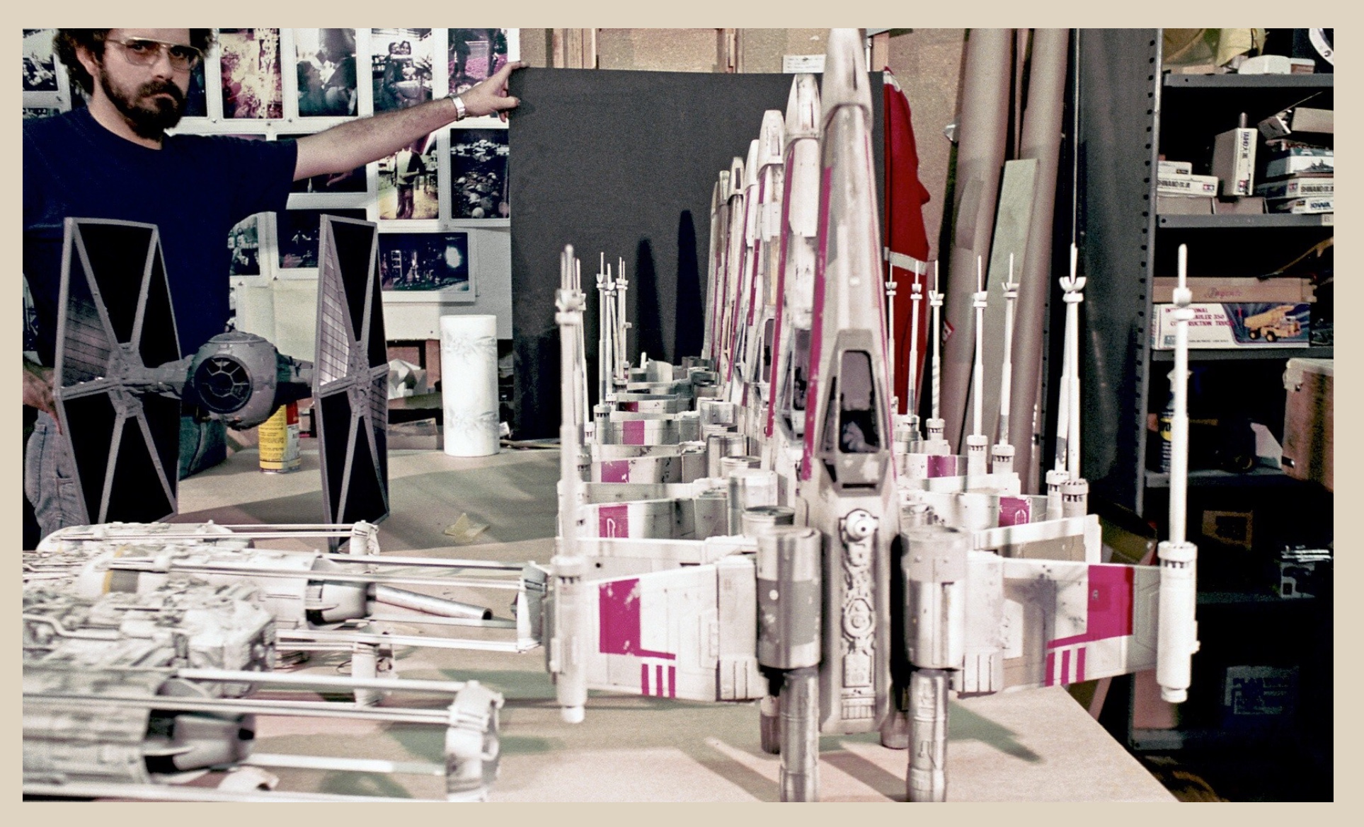 Das X-Wing Model wurde im Studio Scale gebaut, also in derselben Größe wie die Modelle bei den Dreharbeiten. Hinter diesem Modell steckt eine besondere Geschichte: Bei den Dreharbeiten zu Star Wars wurden X-Wing-Modelle hergestellt und für bestimmte Szenen in die Luft gesprengt. Die Einzelteile landeten in einer Box und diese wurde weggepackt. Jahre später zog die Special Effects-Firma ILM um und ließ unter anderem diese Boxen zurück. Beim Aufräumen der Räume tauchten die Boxen wieder auf, die Teile wurden gereinigt und zusammengebaut, fehlende Teile wurden ergänzt. Das Modell wurde zu der Firma ICONS gebracht, die es fertigstellte und Abgüsse der Teile herstellte. Eines der fertigen Modelle bekam George Lucas, der es in seinem Büro aufstellte. Ein mögliches Problem bei diesen Modellen ist, dass die Flügel nach unten absinken. Genau dies passierte auch bei Lucas‘ Modell und er sprach das Problem beim Besuch eines Kollegen an. Dieser nahm das Modell mit, um es zu reparieren, aber jahrelang passierte nichts. Eines Tages bekam dieser jedoch Besuch von Scott Alexander (Captain Cardboard), der sich dazu bereit erklärte, sich um das Problem zu kümmern. Er reparierte den X-Wing nicht nur, sondern nahm auch Messungen an allen Einzelteilen vor. So hatte er die Maße, um ein eigenes Modellbauset zu verkaufen, das sogenannte „Captain Cardboard-Kit“.