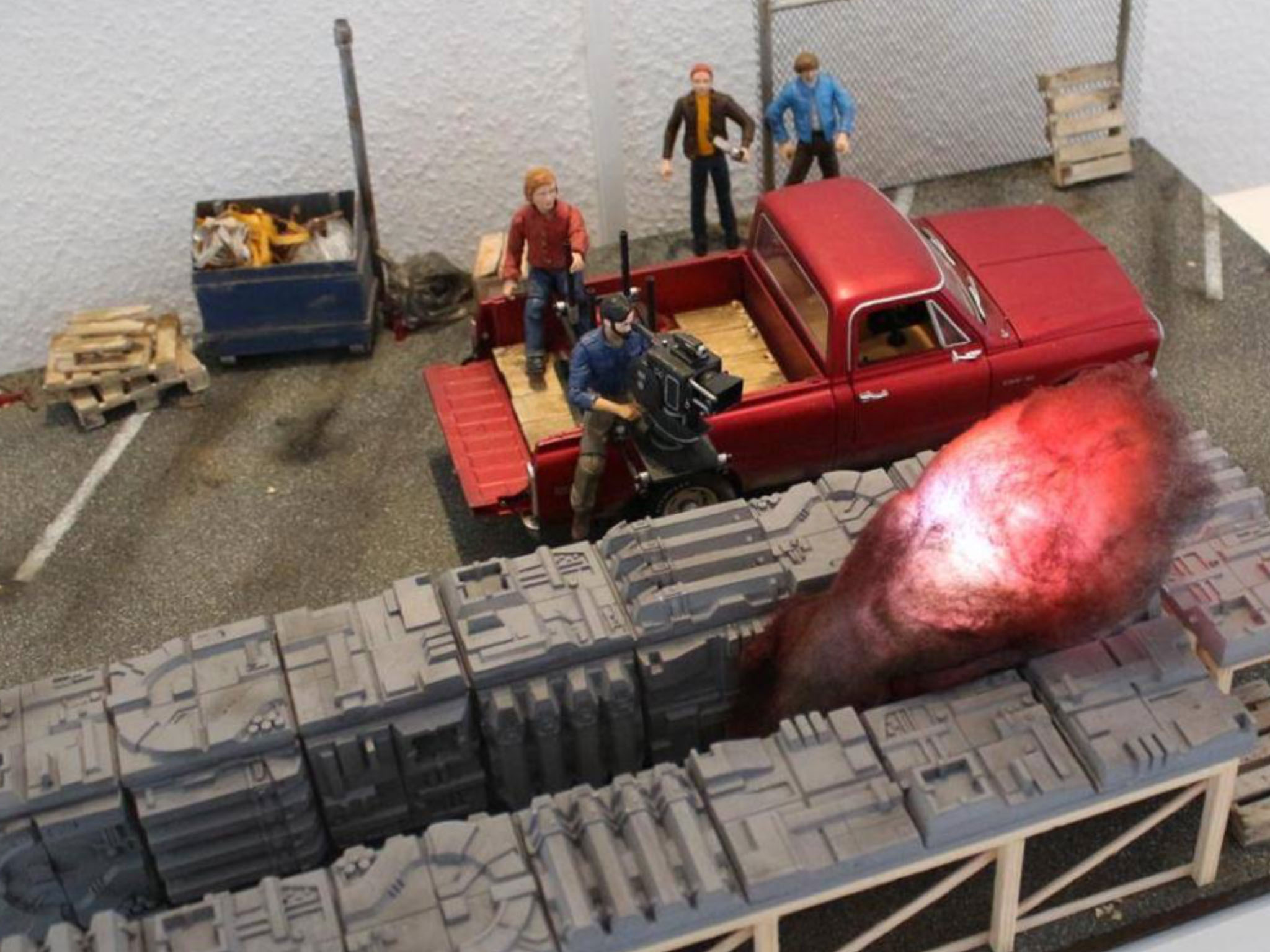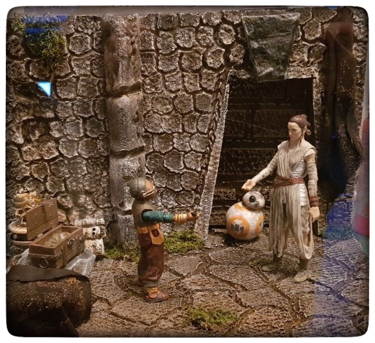 Dieses Diorama wurde während eines Schulpraktikums von Max Karsch und Julian Otten gebaut. Als Easter-Egg haben die Beiden Ihre Namen in Star Wars Schrift auf der Hauswand auf der rechten Seite versteckt. In der dargestellten Szene aus dem Film "Rogue One" erschießt Jyn Erso auf dem Planeten Jedha aus dem Affekt während eines Schusswechsels mit den Imperialen einen imperialen Droiden, der genauso aussieht wie K-2SO. Erst nach dem Schuss wird ihr klar, dass es das Team-Mitglied K-2SO hätte sein können. Dieser kommt aber genau dann um die Ecke und fragt sie erstaunt: "Woher wusstest du, dass das nicht ich bin?"