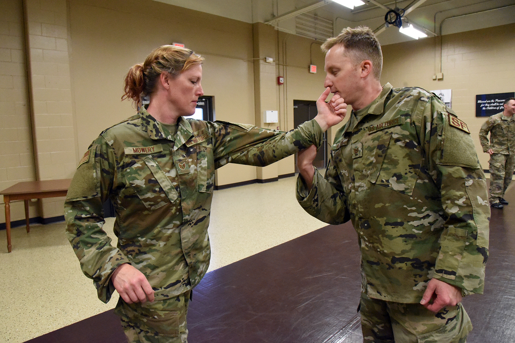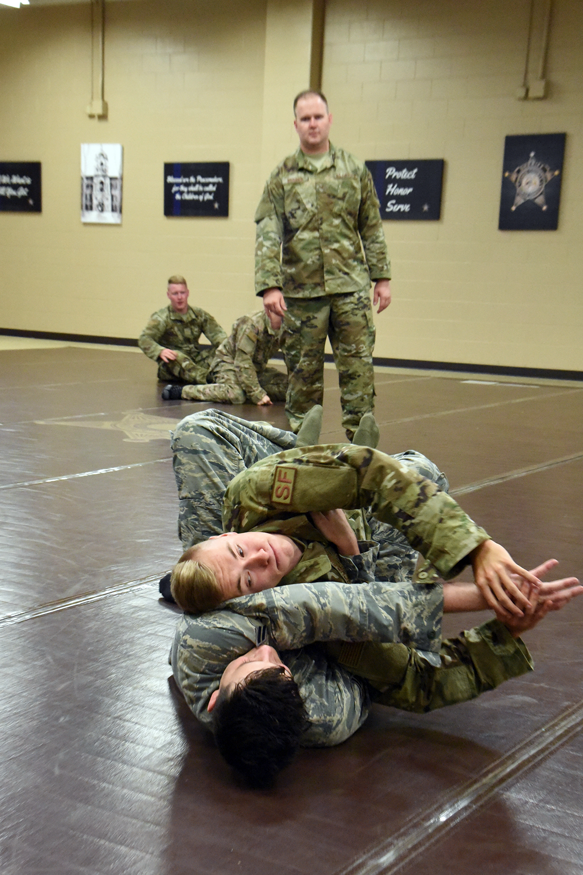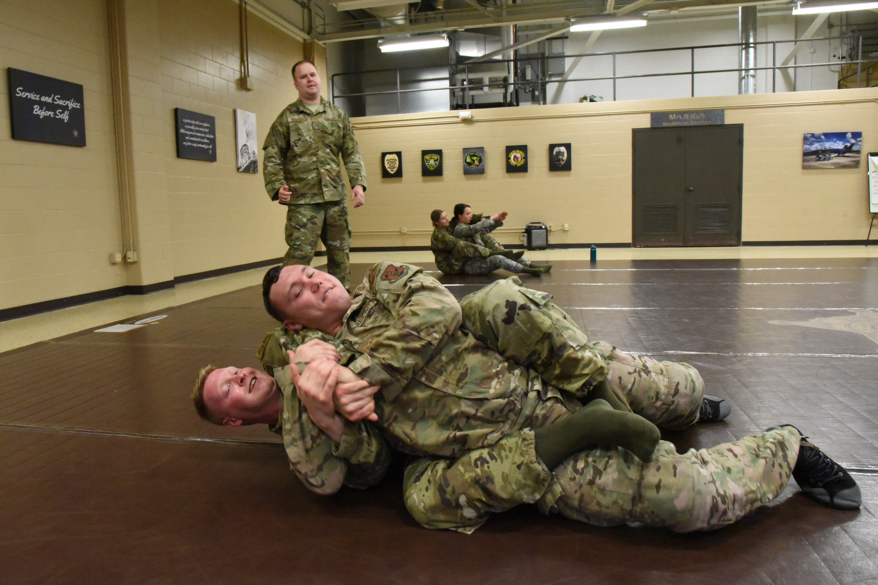 119th Wing security forces members practice combatives skills at the Cass County sheriff's department's gym on June 11. Combatives, a term for hand-to-hand combat training and techniques within the United States military, are used to gain dominance over attackers security forces may encounter while on duty.