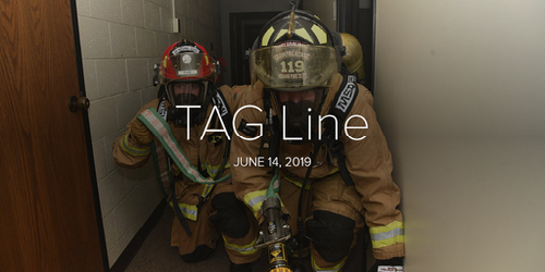 Above: Airman 1st Class Nathan Kankelfitz leads Staff Sgt. Garrett Rixs, both fire fighters in the 119th Civil Engineer Squadron, as they conduct a search for victims through a smoky hallway following a simulated enemy attack during a training exercise at the North Dakota Air National Guard Base, Fargo, N.D., June 8, 2019.