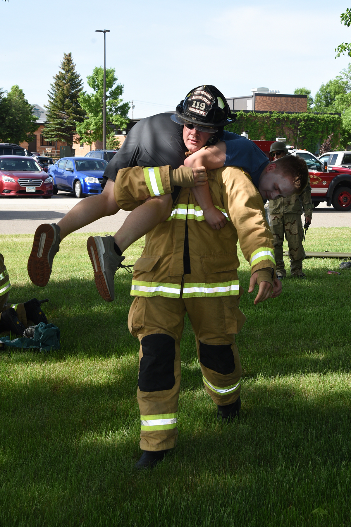 Staff Sgt. Taylor Gerdes, a fire fighter with the 119th Civil Engineer Squadron, carries an Airman acting as an attack victim during a training exercise at the air National Guard base in Fargo June 9.