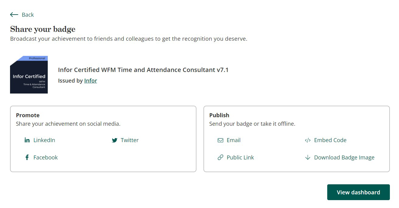 - The Share Badge screen displays with different tabs directing you to connect your social media accounts and share your badge.