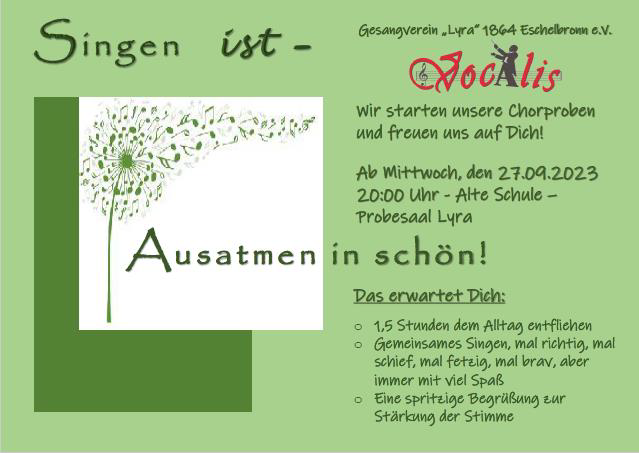 Wir freuen uns auf Dich zur Chorprobe – ab Mittwoch, dem 07.01.2026 20:00 Uhr, Alte Schule, Schulstraße, Probesaal Lyra im Obergeschoss Kontakt: Ursula Nussko, Im Erpfel 2, Eschelbronn, Tel. 06226/40713