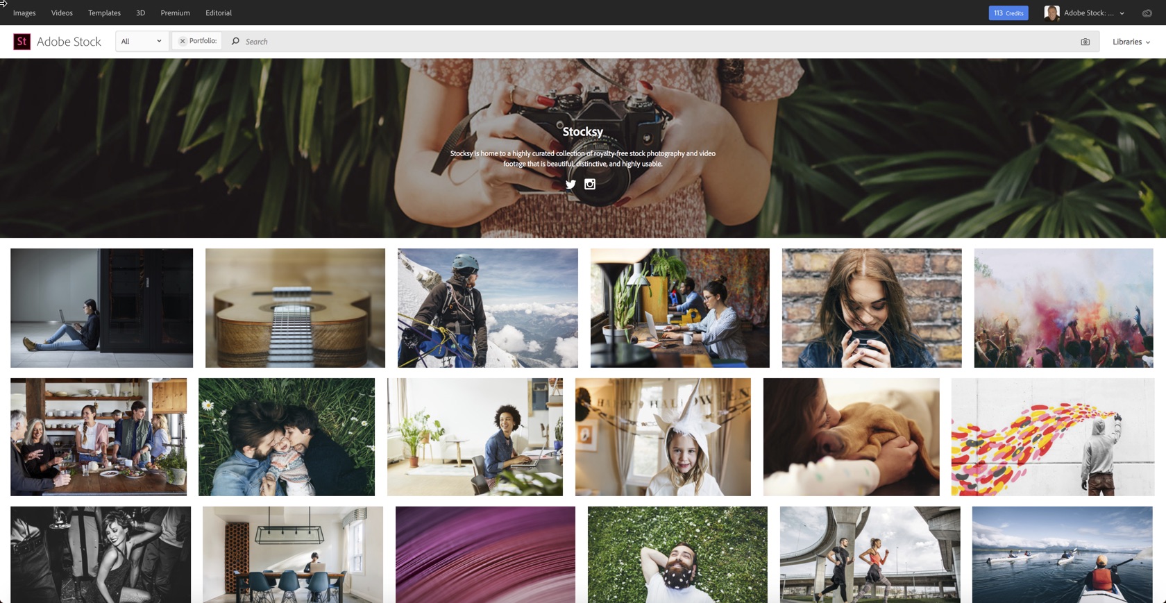 You can search for specific agency creative collections (such as Stocksy, GoPro, Twenty20, Hero Images, etc). Simply run a search with the ‘Agency Name’ on the Adobe Stock website. The search results will include a link to the contributor page.
