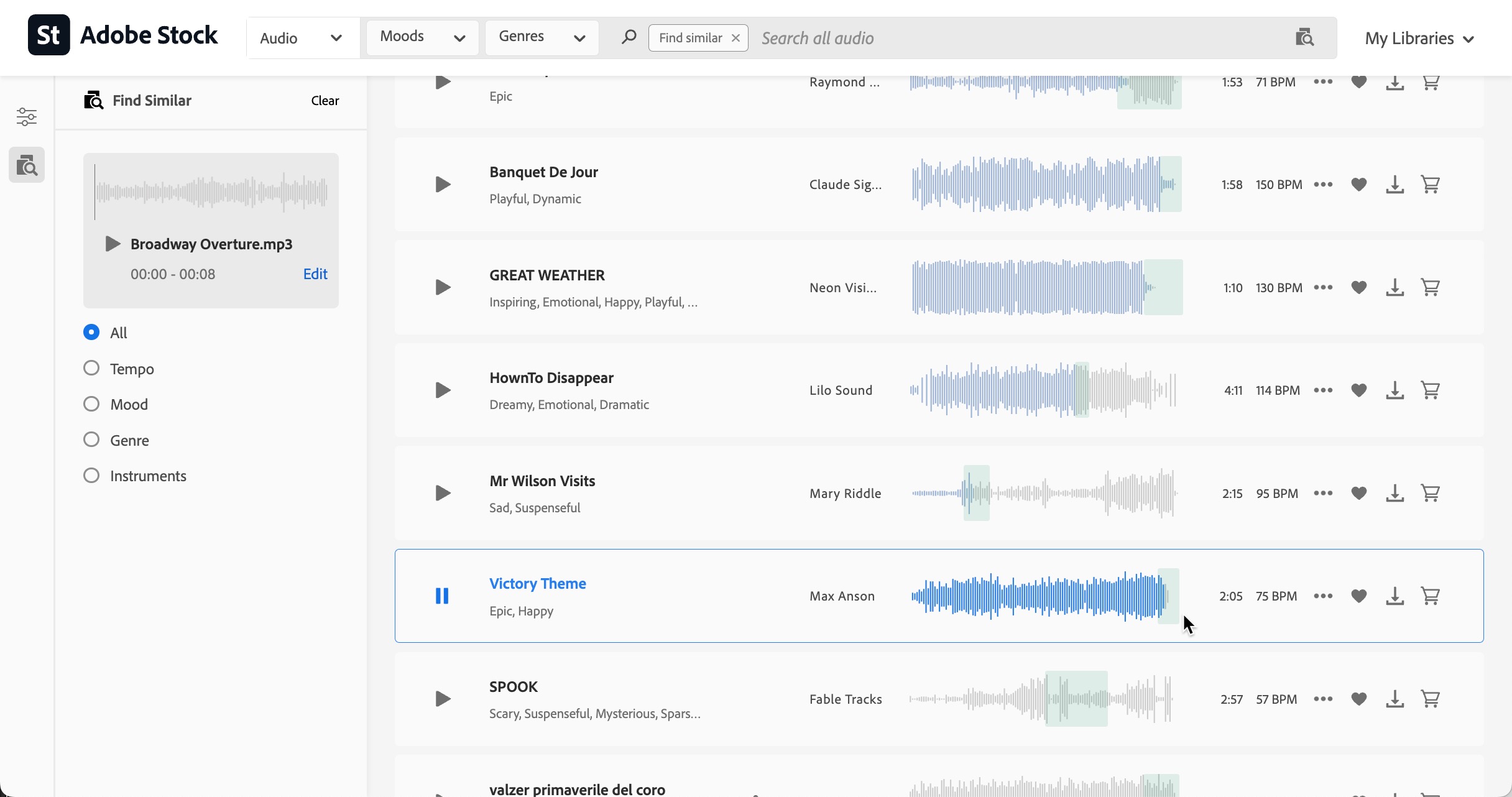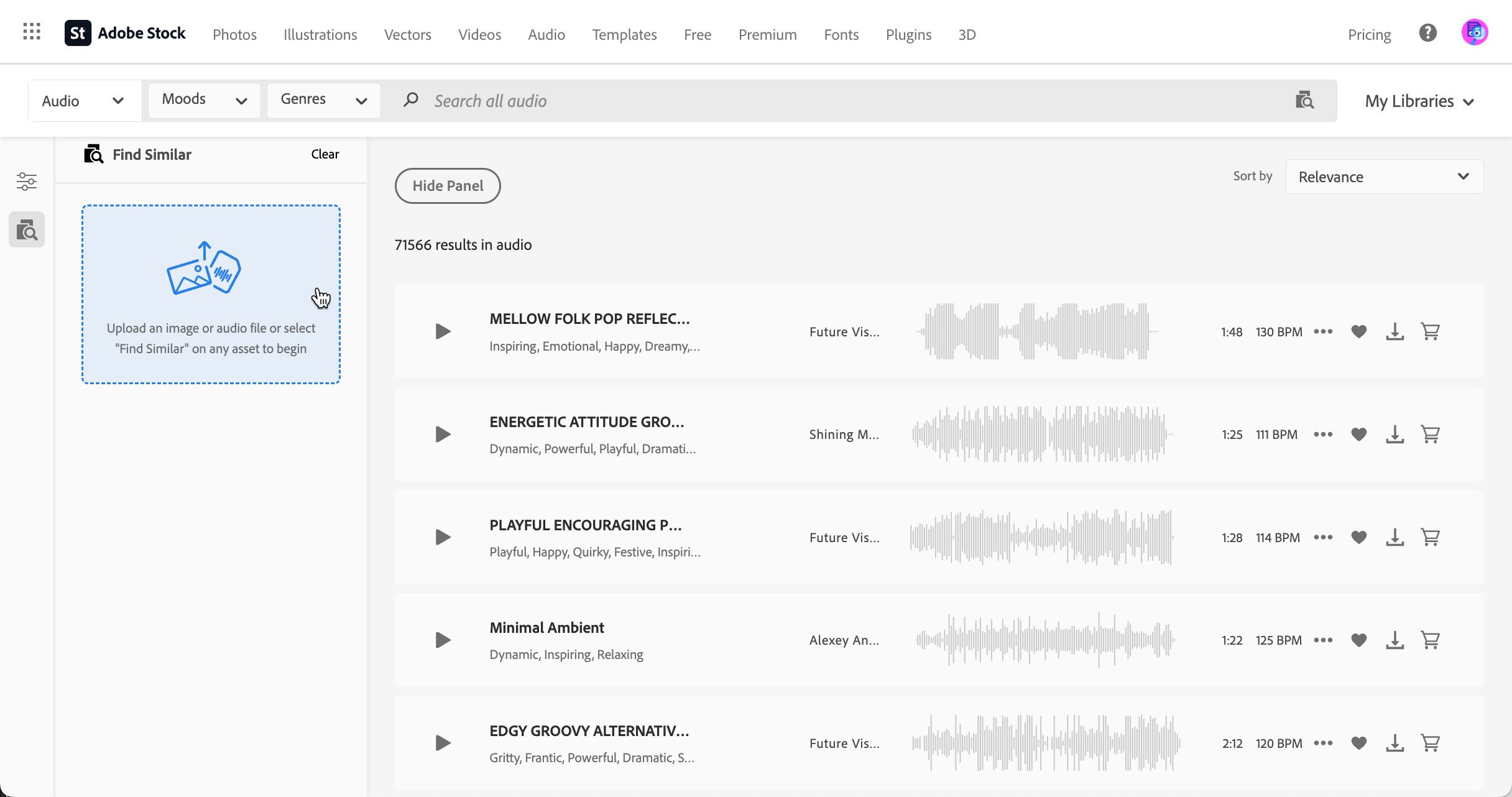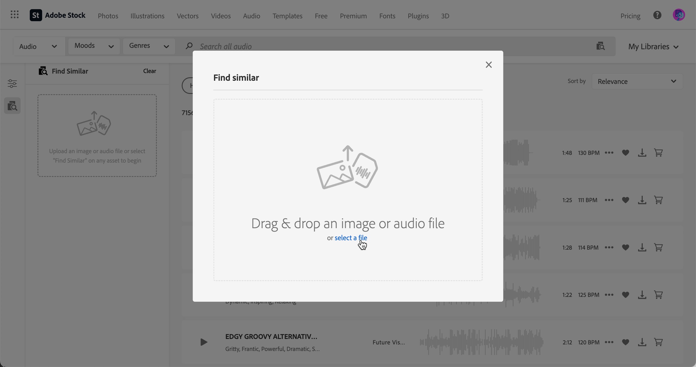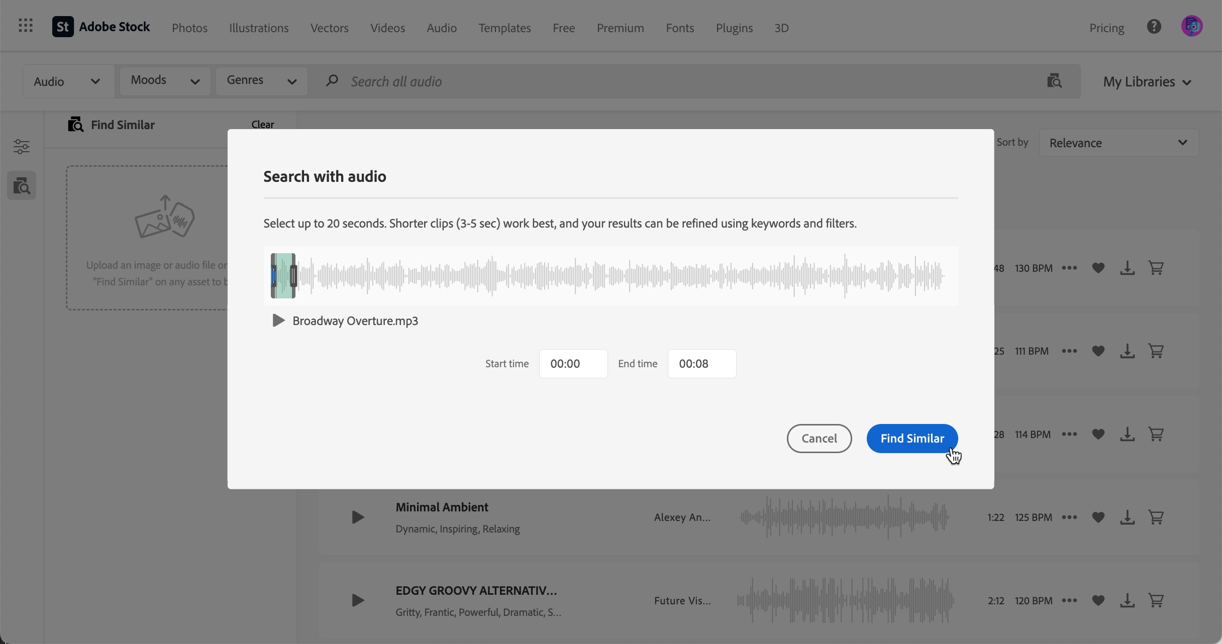 While searching for audio, you have many options to refine your results, just like with photos and video, but you also can also upload a snippet of existing audio - from 3 - 20 seconds - to get you closer to your desired sound.
