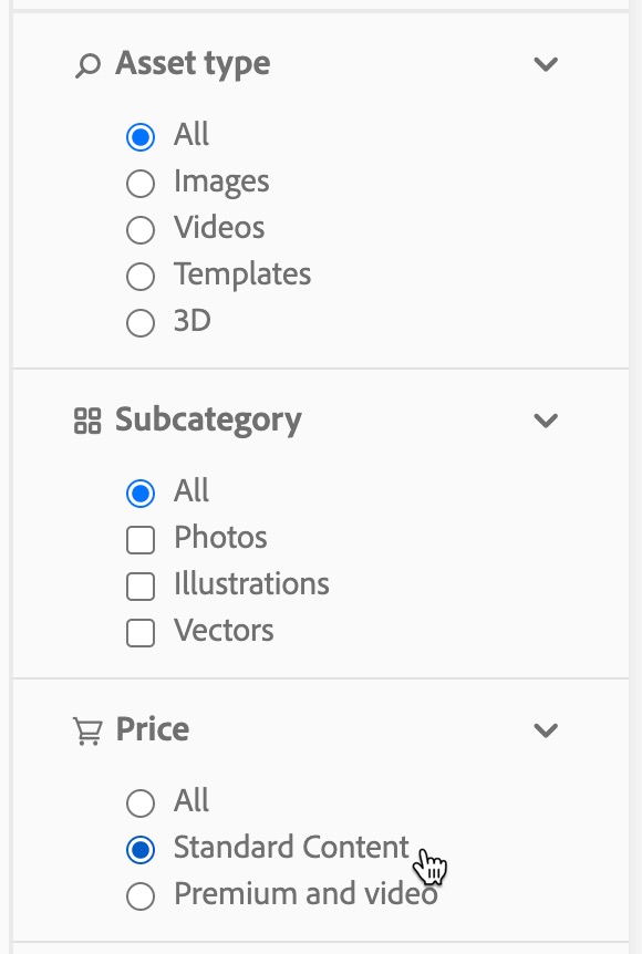 If you want to limit your search to CCE Pro (All Apps Pro) content, lower cost or single-credit assets, you can apply the Standard Content filter. Standard Content represents a large majority of the assets on Adobe Stock, so there will be a lot of content to choose from. You will also find more than 45K video clips in our FREE category.