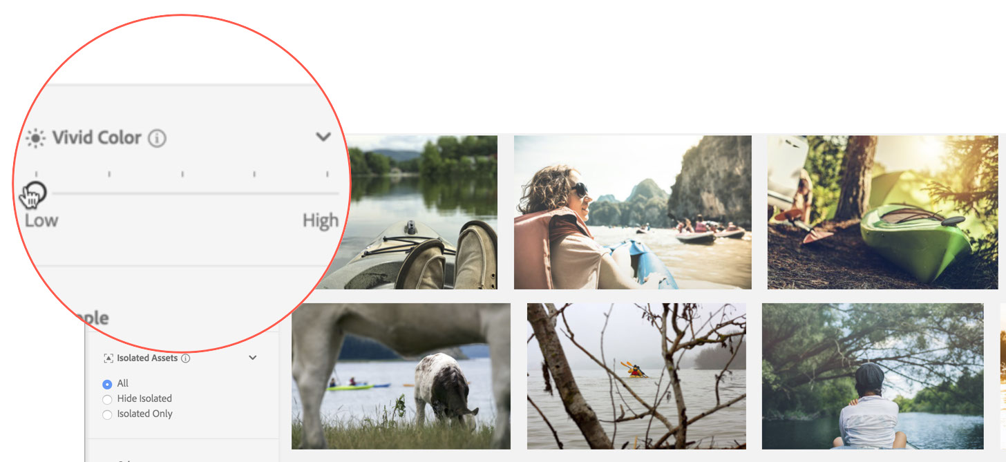 Using a sliding scale, the Vivid Color aesthetic filter allows you to narrow your search results based on color saturation. The slider enables you to choose lower or higher color intensity.