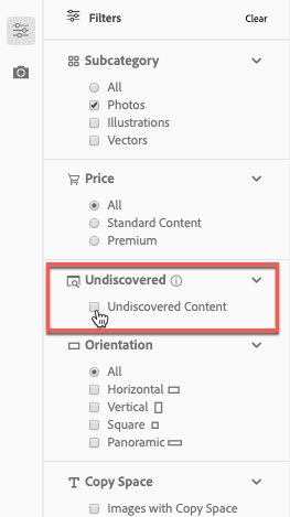 A challenge with microstock can be feeling confident your image choices are unique. Enabling the Undiscovered Content filter could help you quickly find the right image and one that no one else has licensed through Adobe Stock.