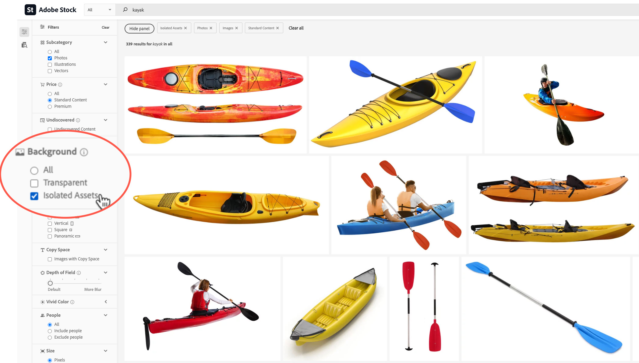 If your goal is to find images that can be easily masked so they can be dropped into other backgrounds, you can also filter for isolated images. You can choose to show only or exclude isolated imagery from the search results.