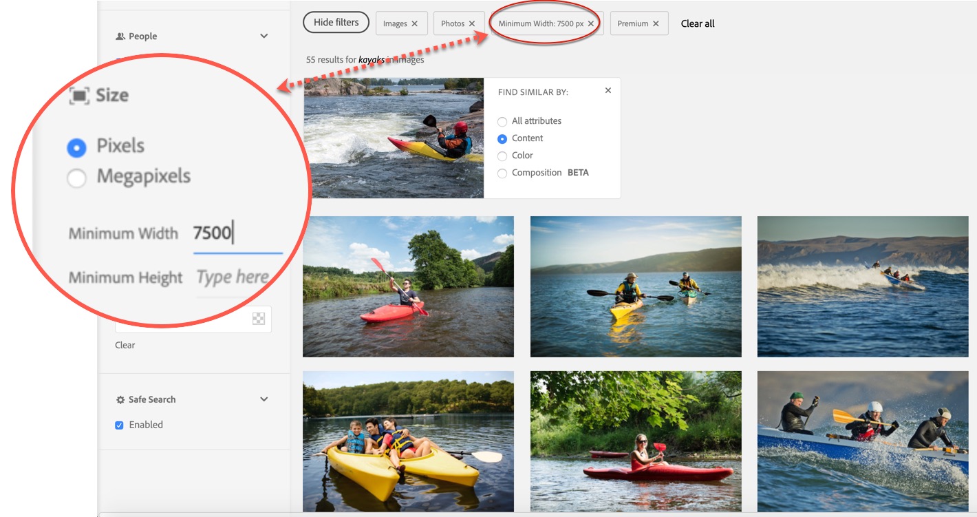 The Size Filter allows you to set a minimum pixel dimension or megapixel resolution, which can further narrow down your search results.