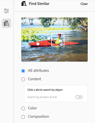 When you choose to Find Similar from the Adobe Stock collection, rather than uploading an image, you can fine-tune the result using Search by Object. Your new source image will show a range of white dots. Click on any dot to search for that particular object.