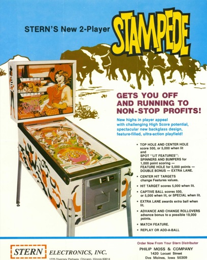 Stern acquired Chicago Coin Machine Company in December 1976 and 'Stampede' was its first game, a continuation of the production of Chicago Coin's 1977 'Stampede'.
