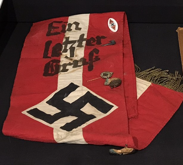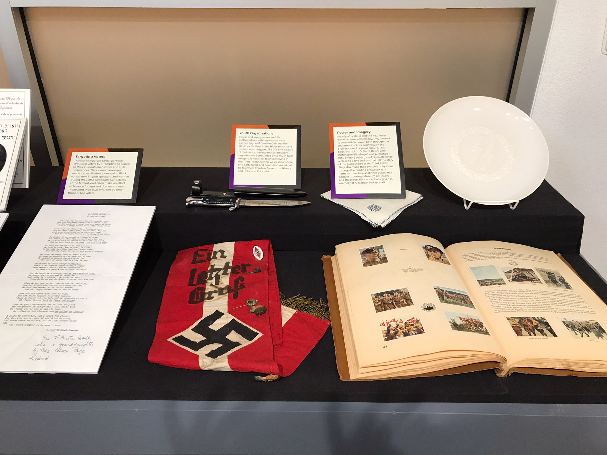 Shortly after Hitler and the Nazi Party gained control of Germany, they worked to consolidate power, both through the enactment of laws and through the proliferation of popular culture. This book “Kampf um’s Dritte Reich: Eine Historische Bildefolge,” waspublished in 1933, offering collectors of cigarette cards a place to paste stickers that tell the story of the glorious rise of the Third Reich. They also made their symbols ubiquitous through the printing of swastikas on items as mundane as dinner plates and napkins. Courtesy Museum of History and Holocaust Education, book given in memory of Alexander Maczyorskii.
