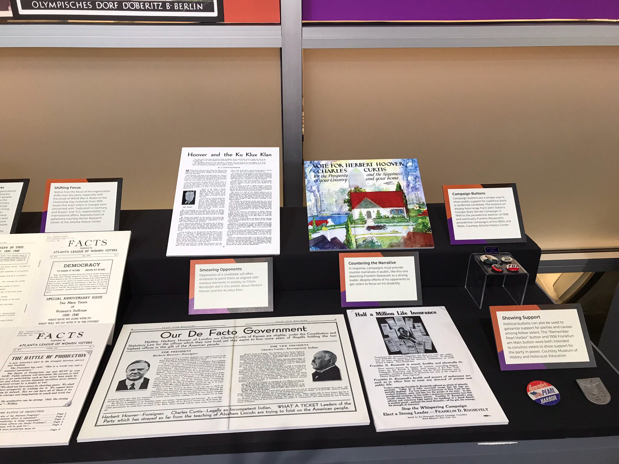 Campaign buttons are a simple way to show public support for a political party or preferred candidate. The buttons on display here range from John Slaton’s Georgia State Senate Campaign in 1909 to the presidential election of 1928 and eventually Franklin Roosevelt’s presidential campaigns of the 1930s and 1940s. Courtesy Atlanta History Center.