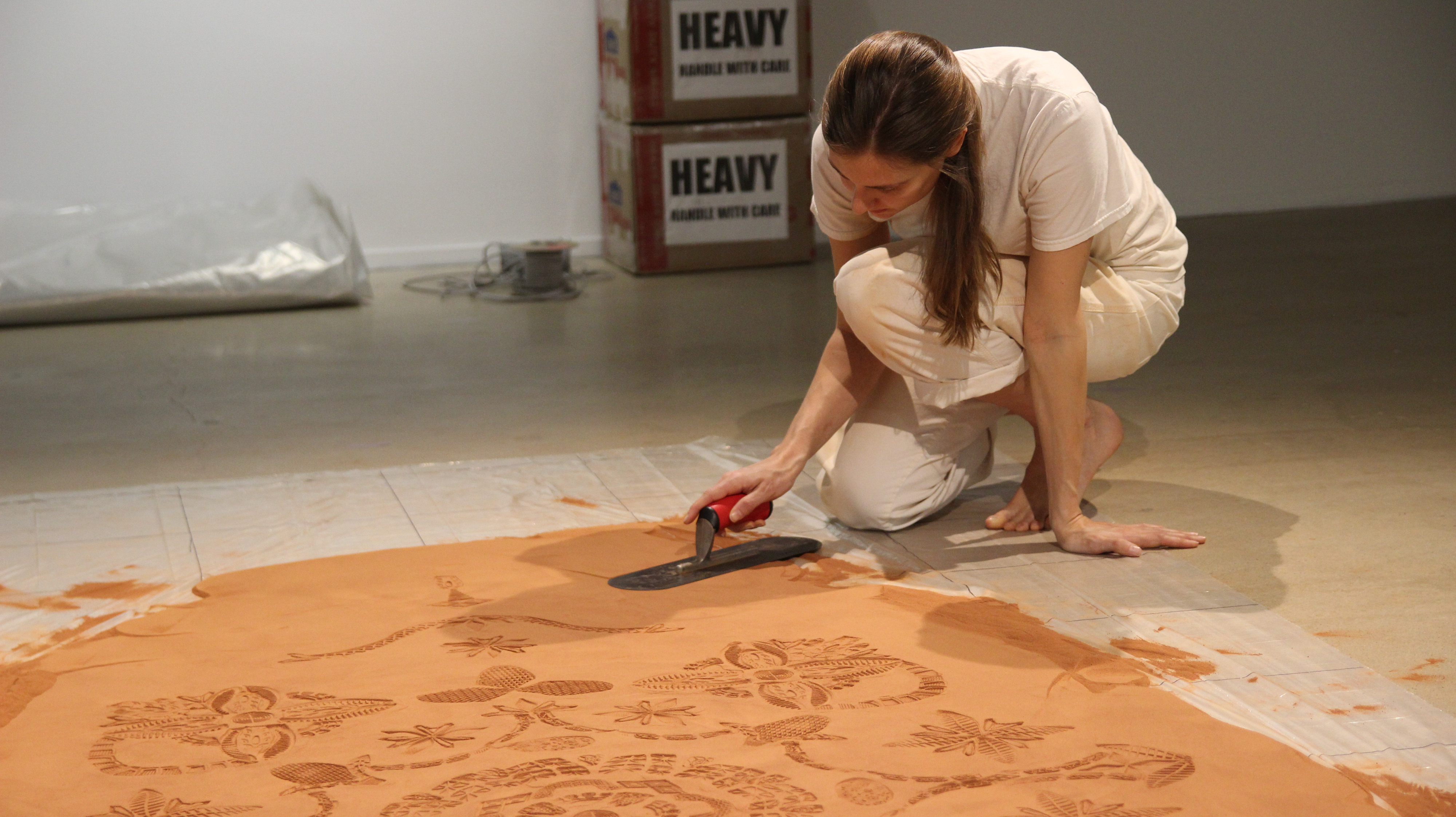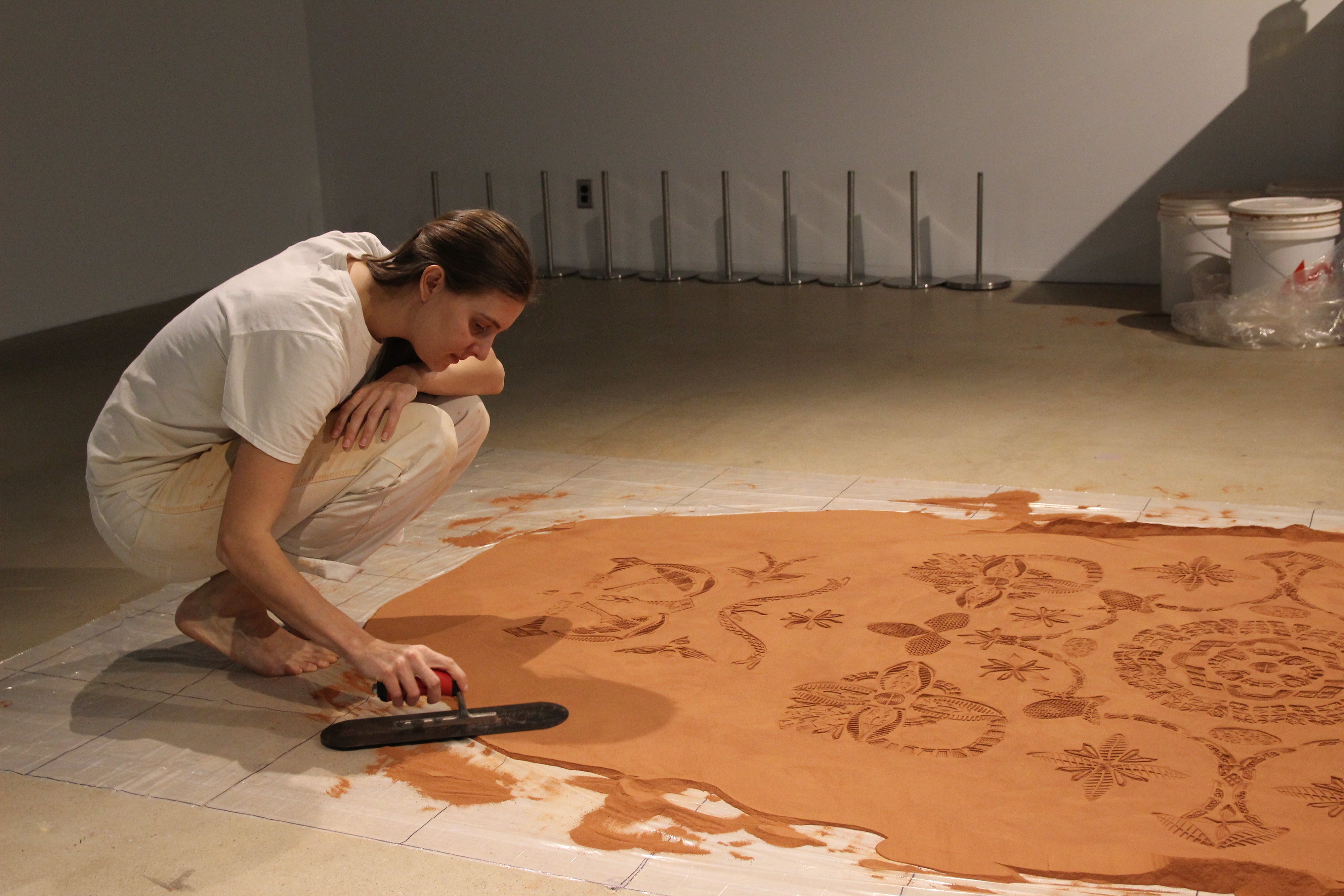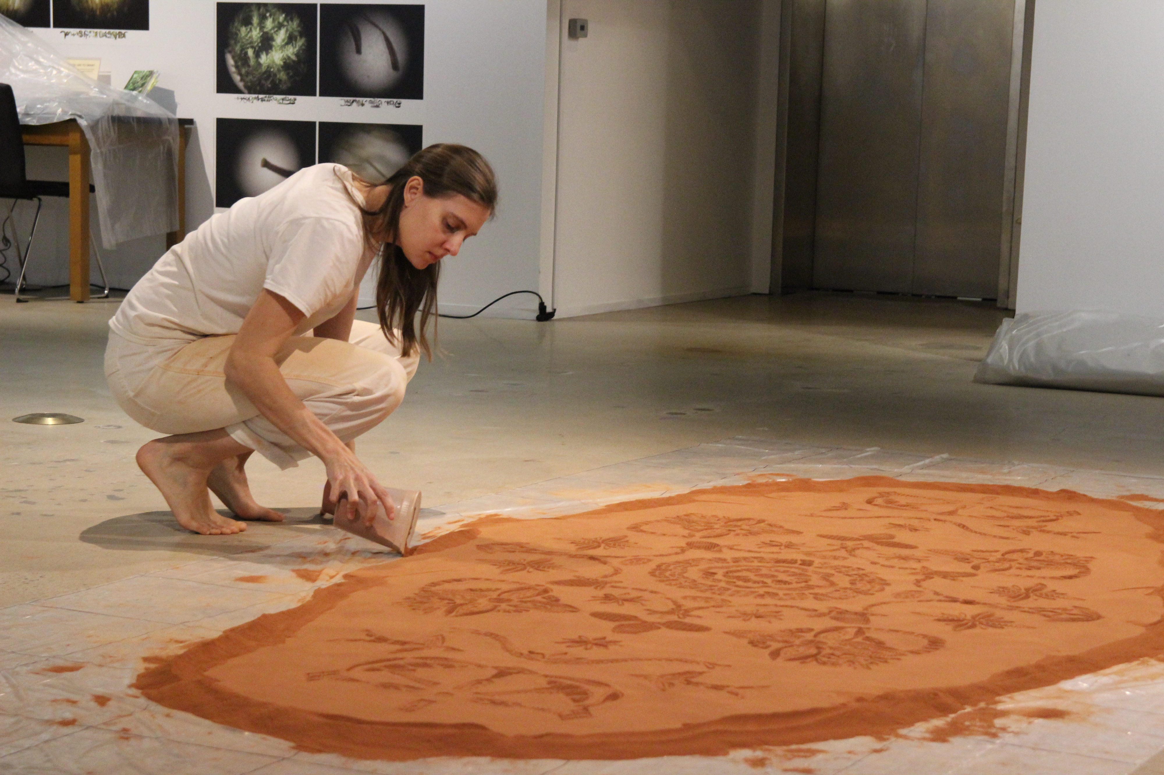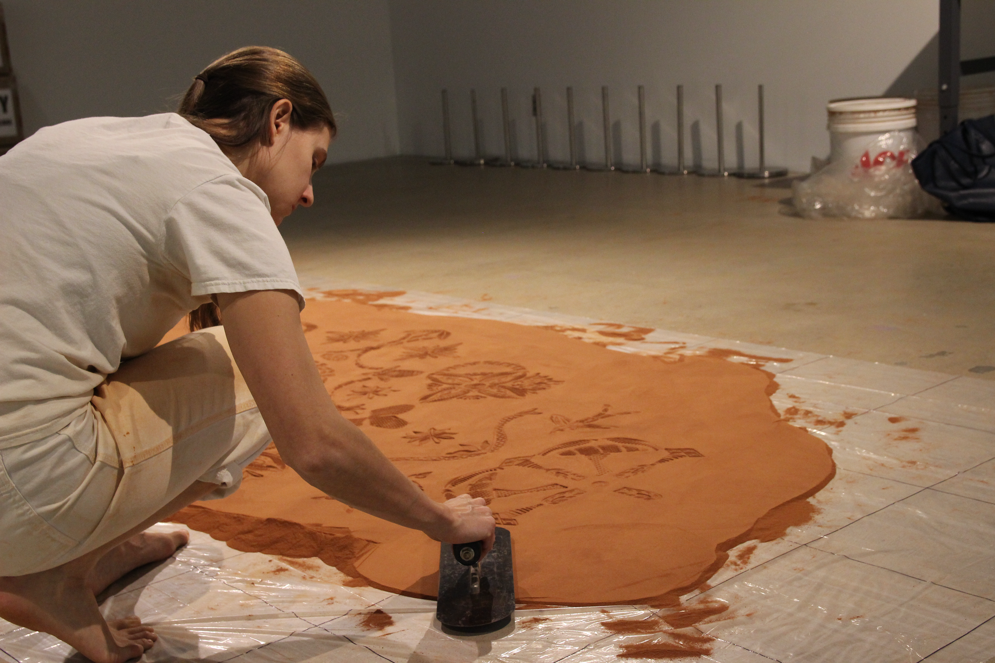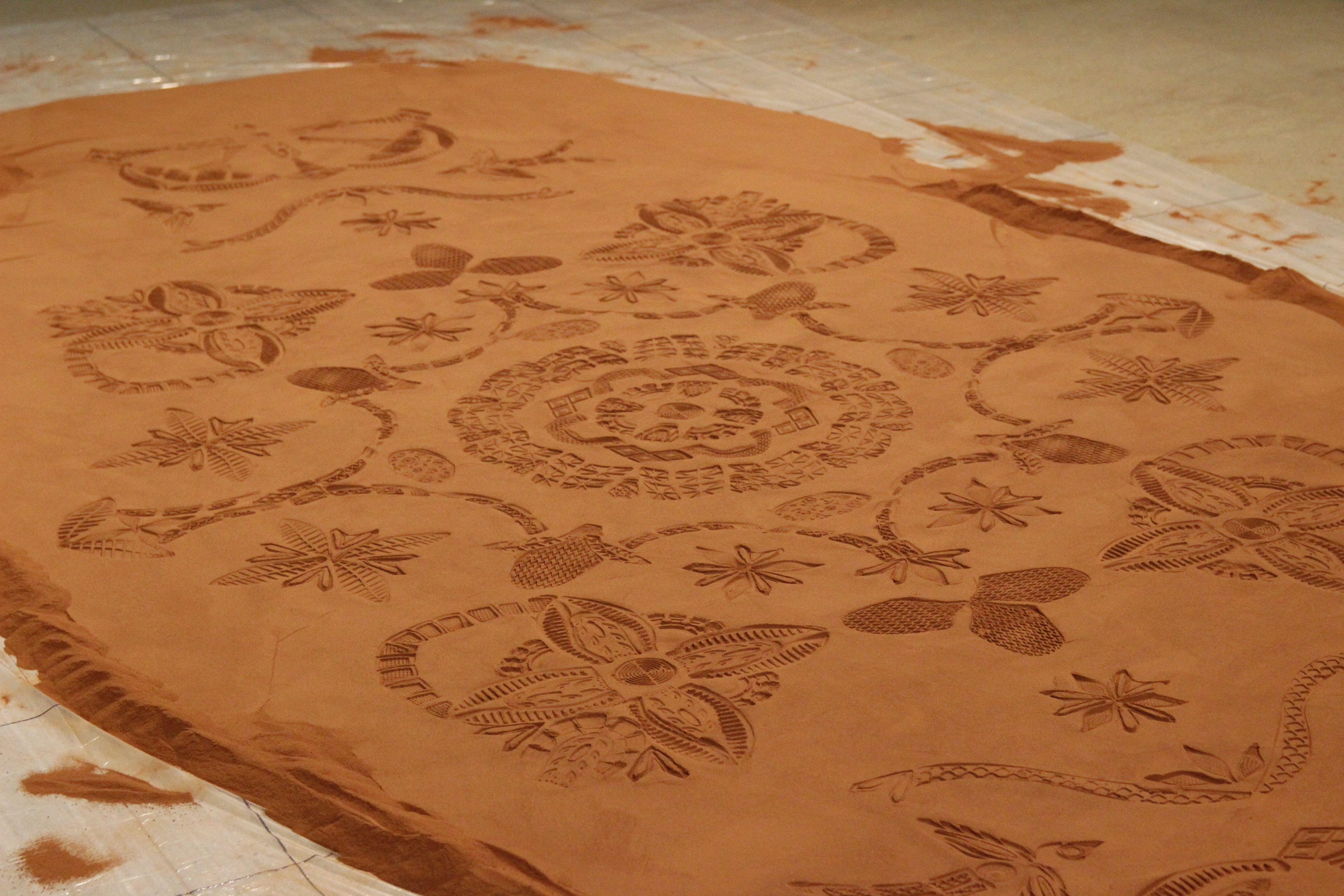 This work embodies the complicated history of humans’ relationship to nature and focuses on the region from which the dirt was sourced, where human presence has deeply altered the landscape. The rug begins with earth. Red, loose soil from Oklahoma, where Detrixhe spent three years, is gathered and hand-sifted into a fine powder-like substance. Spiraling outward from the center of the plotted rug, the dirt is poured, smoothed, and imprinted with modified shoe-soles to create intricate patterns. The refining and sifting of the material and the imprinting of the pattern is a meditation on this past, a gesture of sensitivity, and the desire for understanding.