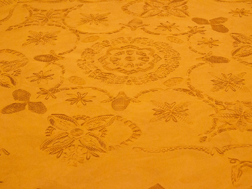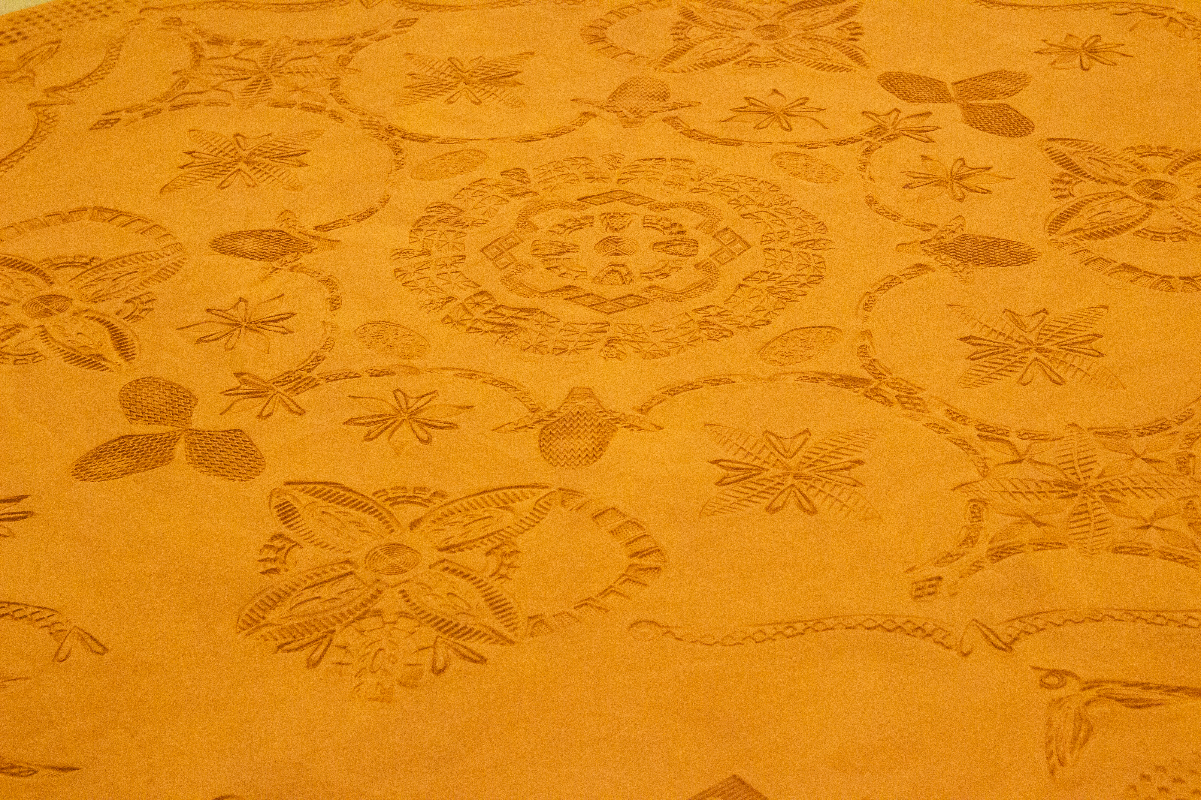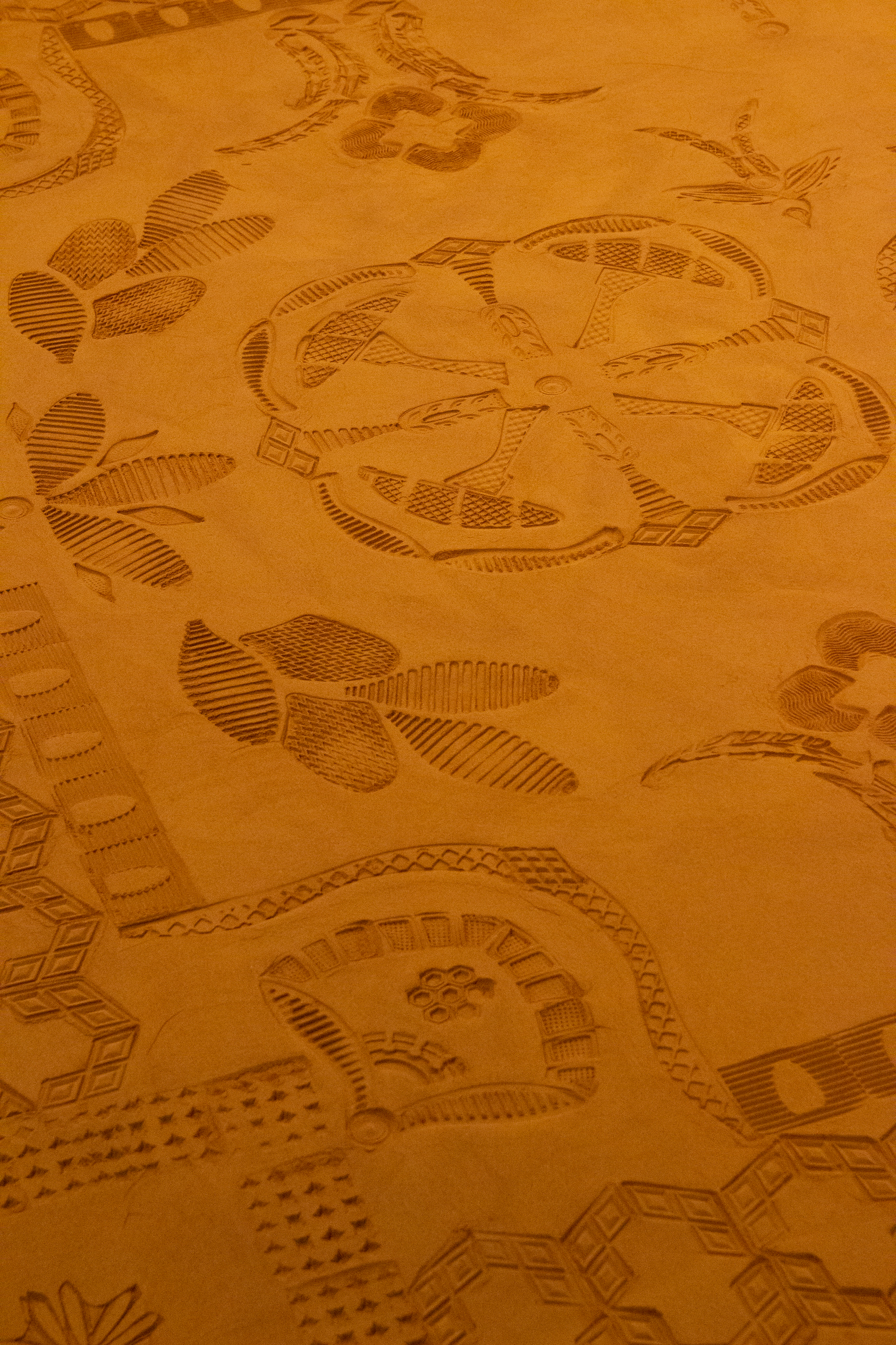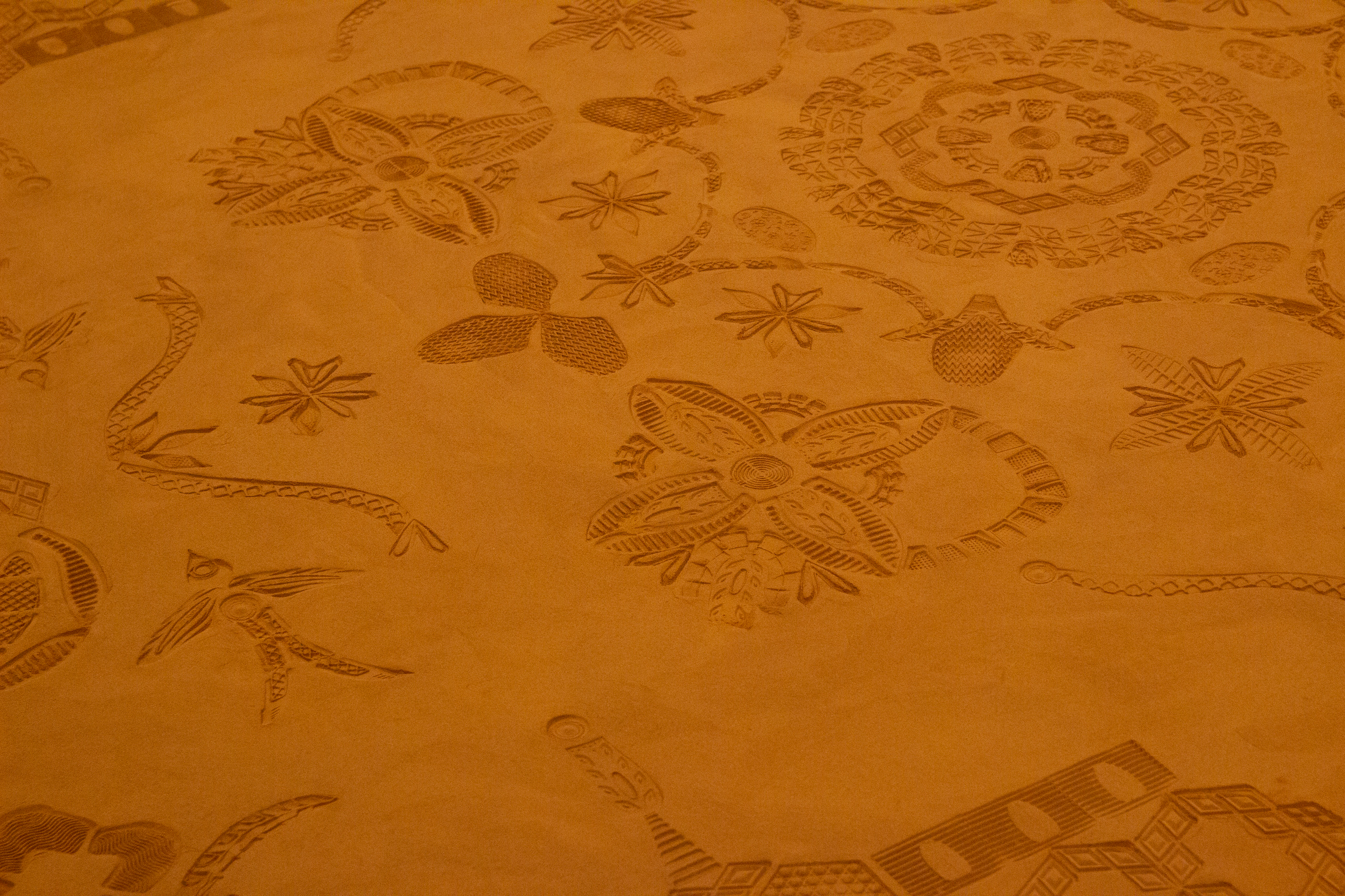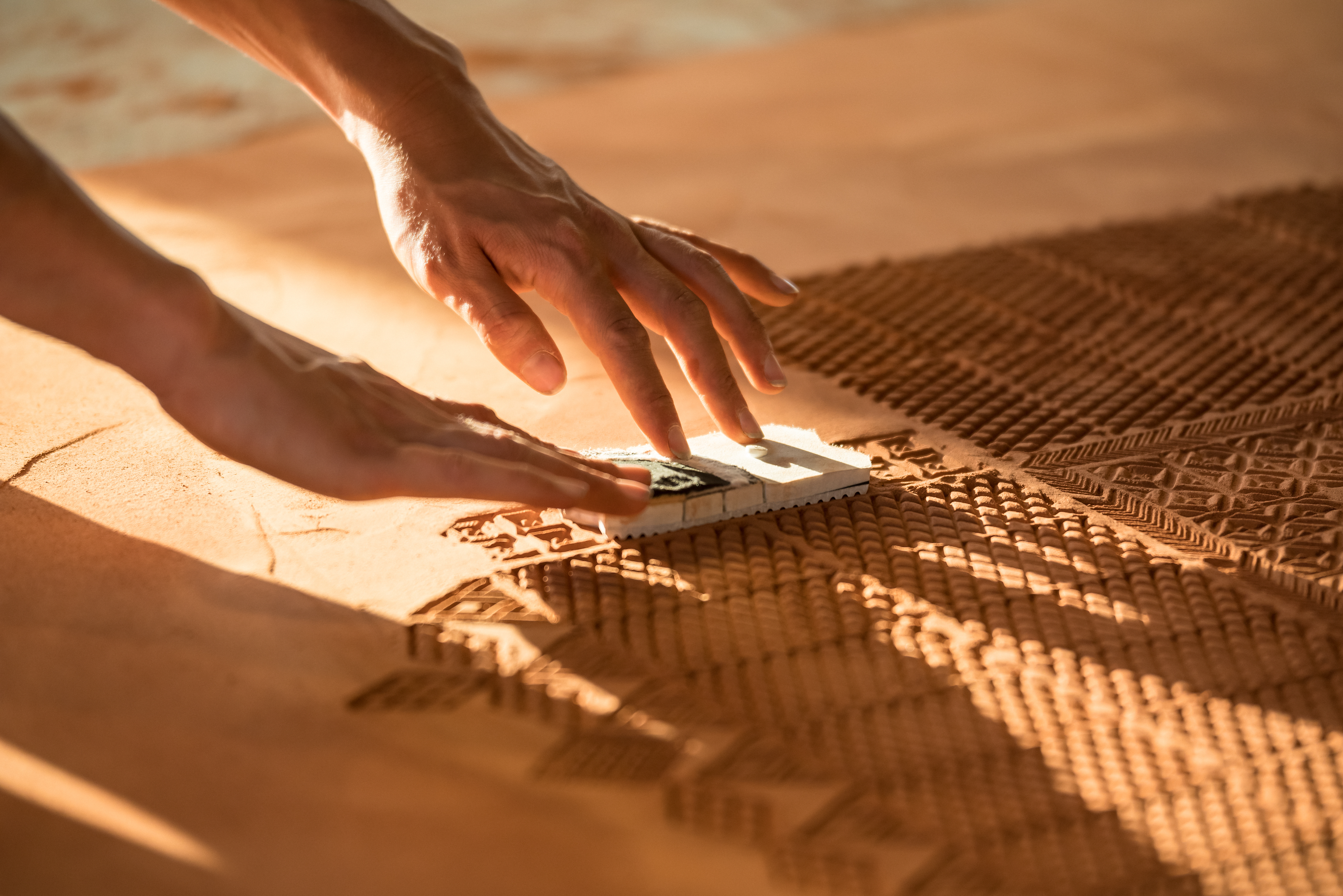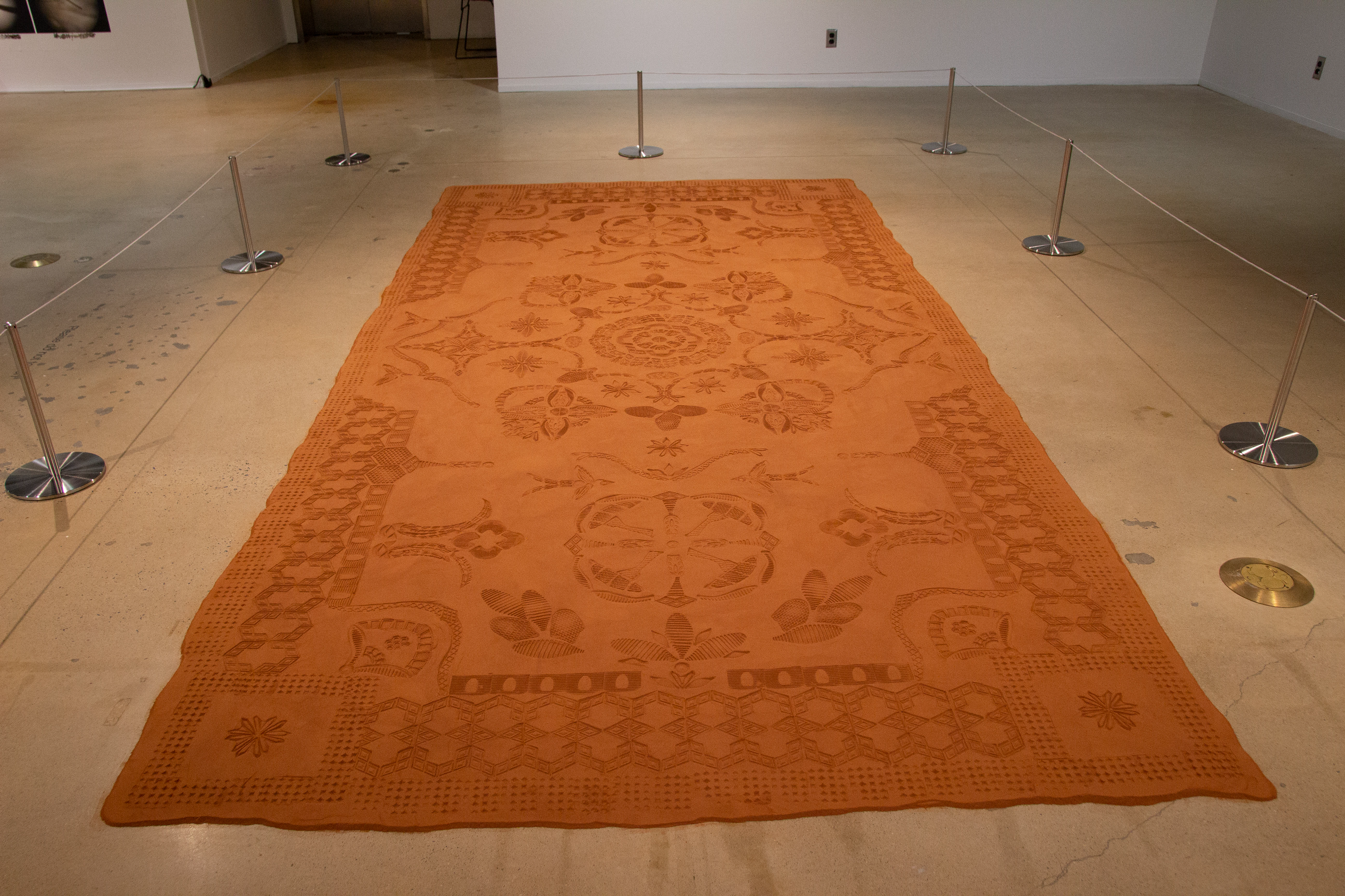 This work embodies the complicated history of humans’ relationship to nature and focuses on the region from which the dirt was sourced, where human presence has deeply altered the landscape. The rug begins with earth. Red, loose soil from Oklahoma, where Detrixhe spent three years, is gathered and hand-sifted into a fine powder-like substance. Spiraling outward from the center of the plotted rug, the dirt is poured, smoothed, and imprinted with modified shoe-soles to create intricate patterns. The refining and sifting of the material and the imprinting of the pattern is a meditation on this past, a gesture of sensitivity, and the desire for understanding.