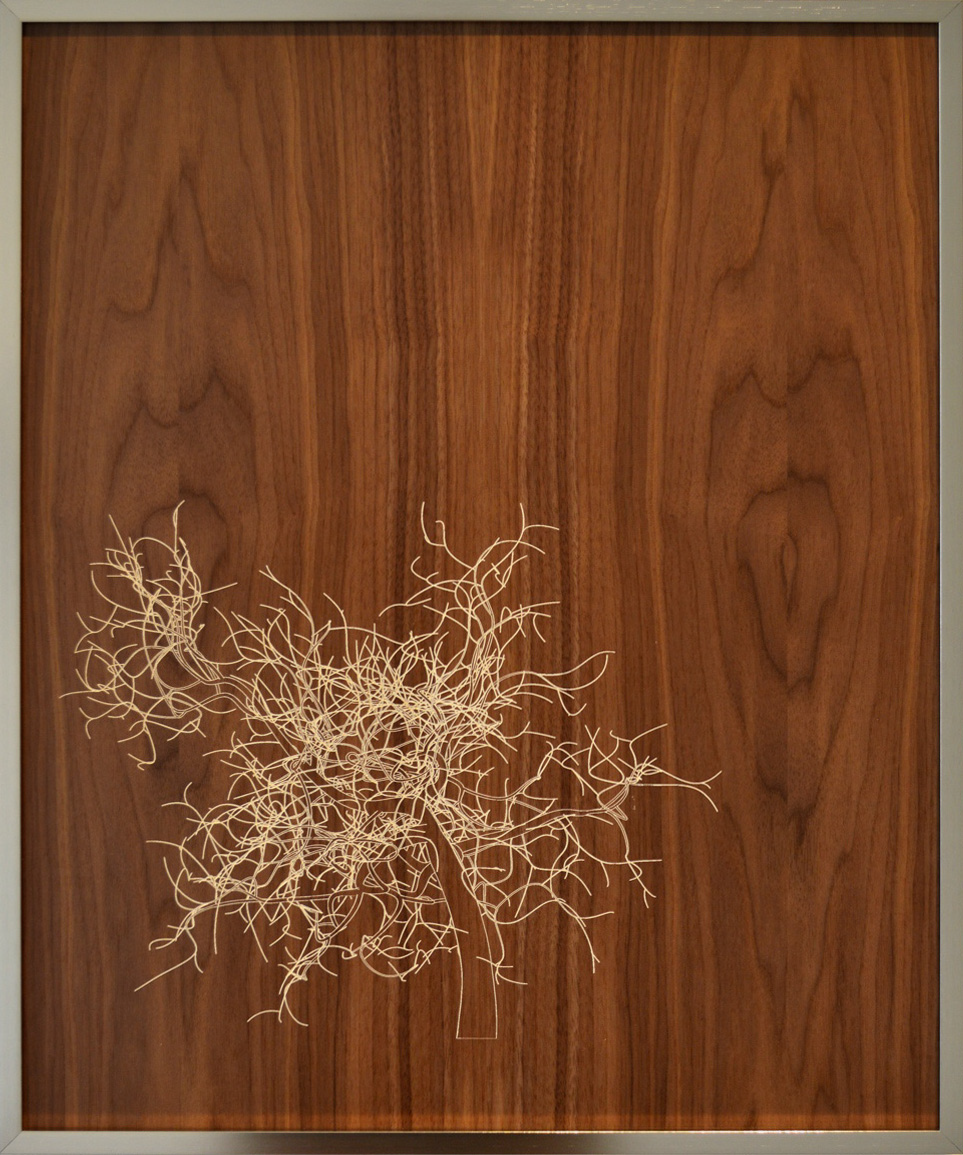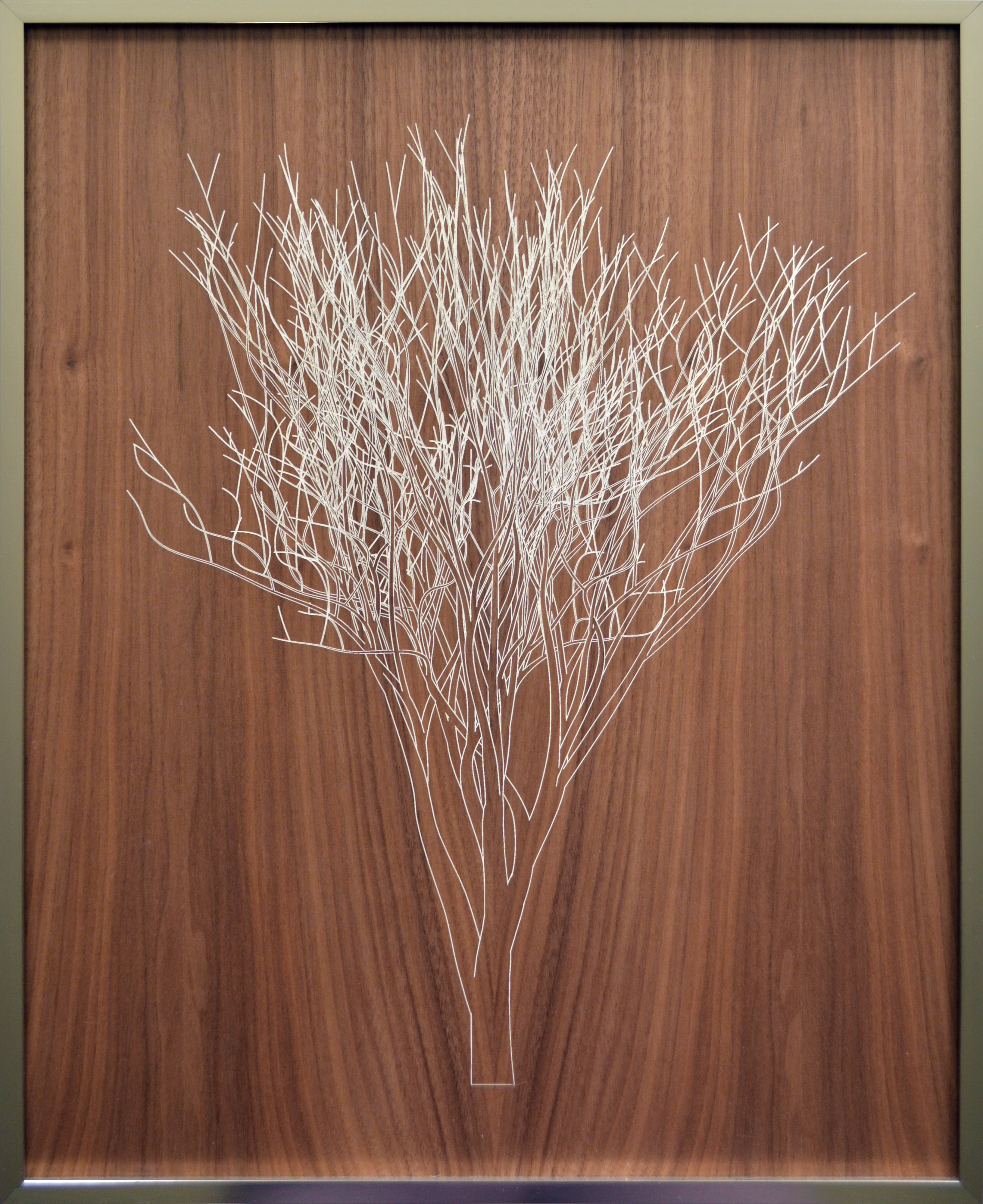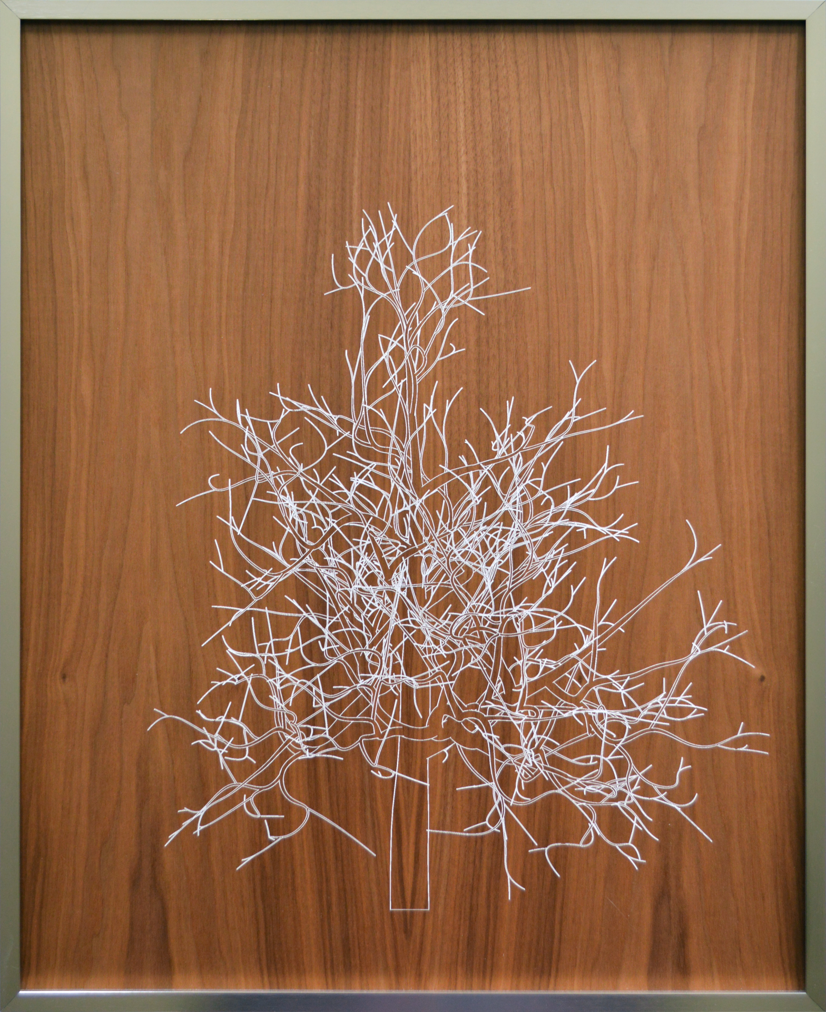 Growth patterns, on the macroscale, were derived from academic research and extensive observation. These patterns were translated into an algorithm embedded in a CAD program. Through the manipulation of multiple inputs, a near infinite variety of trees can be made, resembling a wide range of different species. These trees are then 3D printed in nylon and displayed as components of digitally fabricated sculptures, or they are converted into drawings that are etched into walnut plywood with a laser cutter and in-filled with paint.