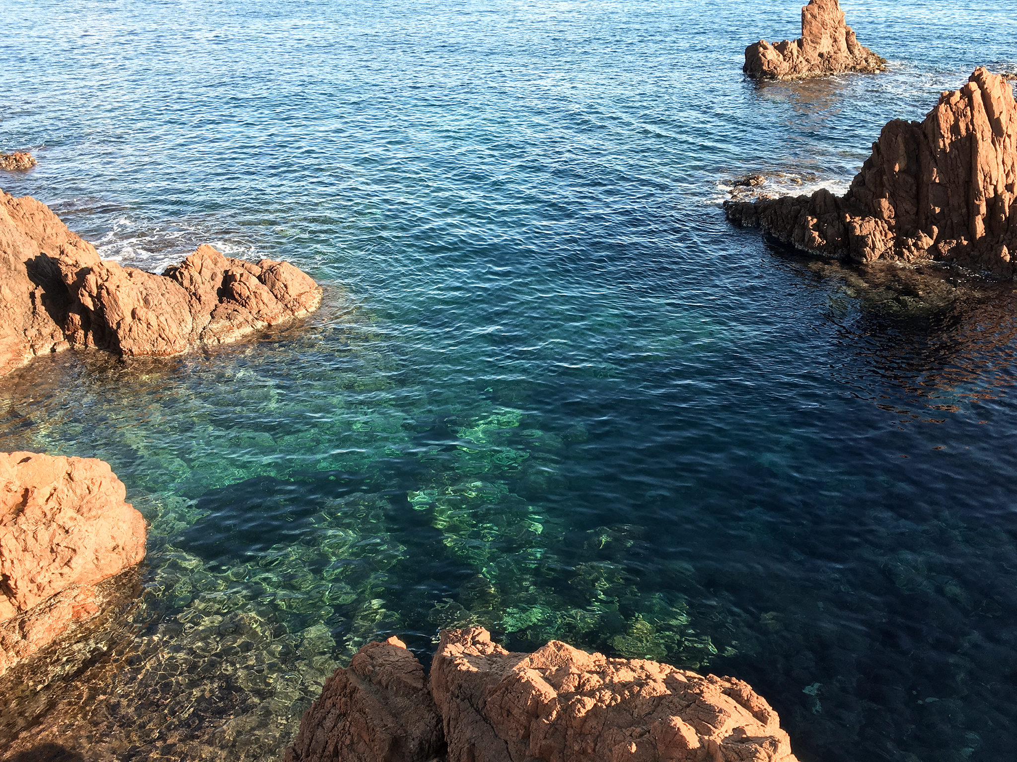 Sie liegt in Theoule sur Mer. Das ist ein kleiner Ort auf einer großen Fläche, von der ein Großteil Naturschutzgebiet ist. Unser Stadtteil, wenn man so will, heißt Miramar, Luftlinie sind es von der Wohnung ungefähr 800 m bis zum ersten Strand. Ich sage mit Absicht "ersten Strand", denn rechts lang in Richtung Saint Raphael beginnt das Massif de l'Esterel und dort befinden sich ganz viele wunderhübsche, kleine Buchten, wo man herrlich baden, planschen, schnorcheln und entspannen kann. Sieh selbst: