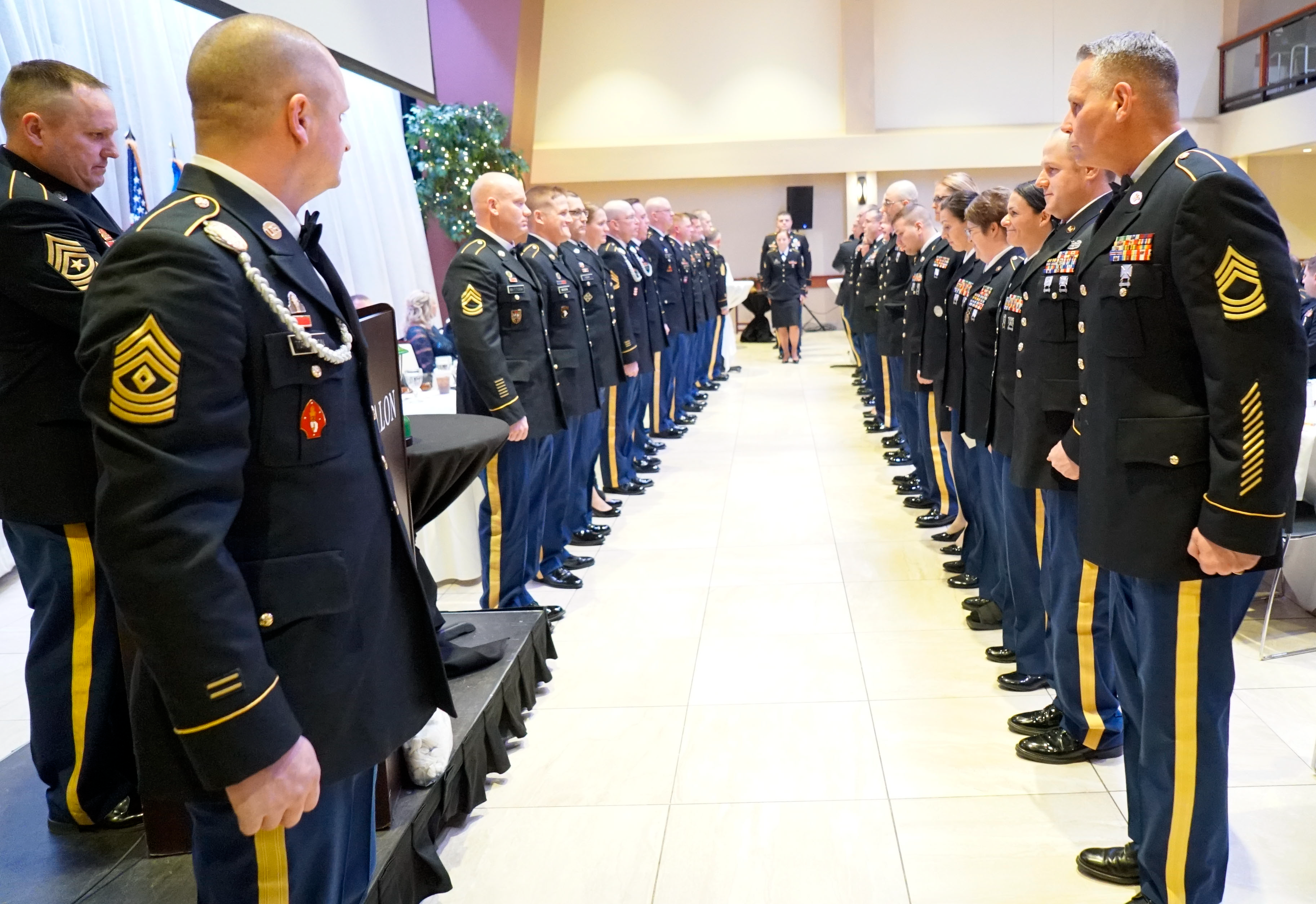 Senior Non-Commissioned Officers (NCOs) of the 141st MEB stand in line to congratulate new NCOs during an induction ceremony at their dining-out event in Fargo Jan. 11.