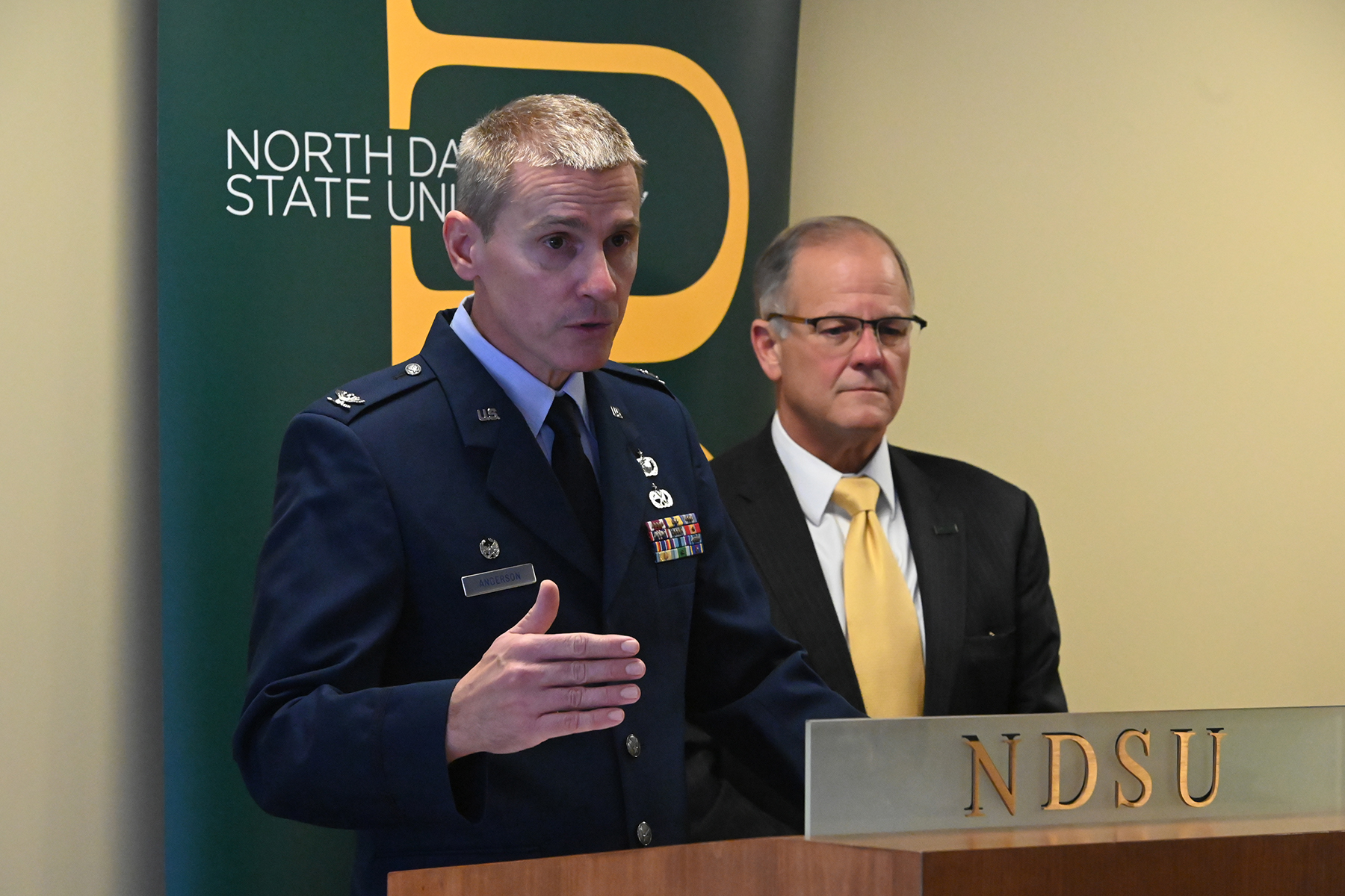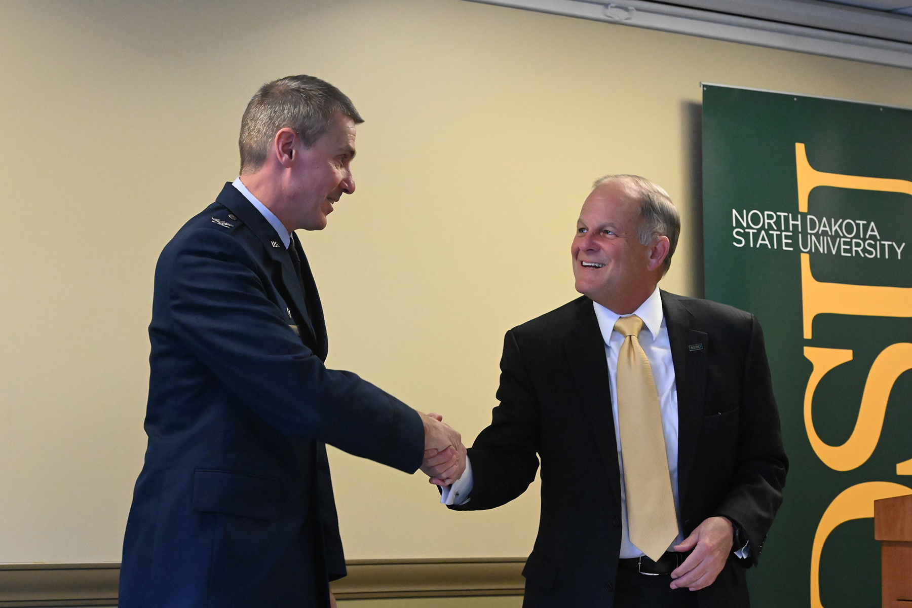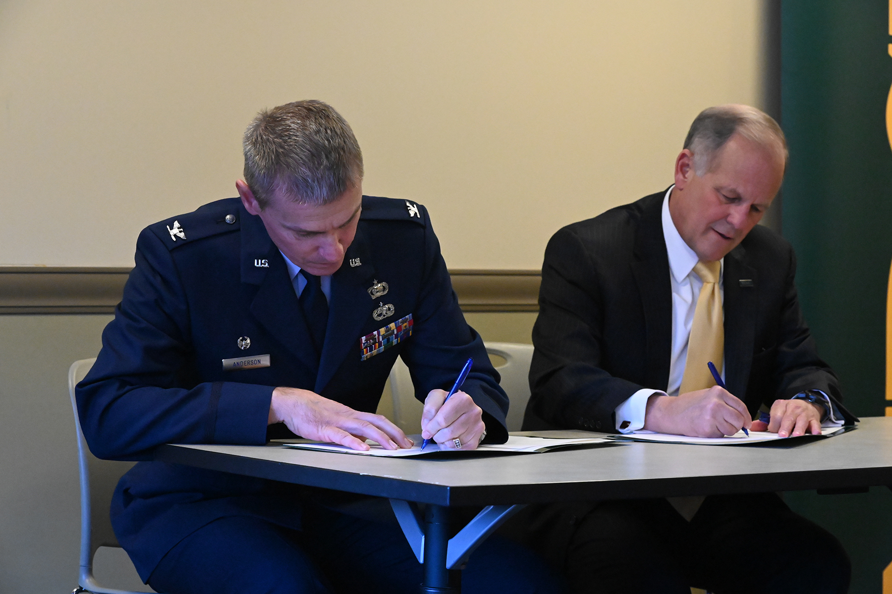 N.D. State University (NDSU) President, Dean Bresciani and 119th Wing commander, Col. Darrin Anderson signed a Memorandum of Understanding (MOU) on Jan. 14 on the NDSU campus. The MOU creates a process to transfer professional military education credits into undergraduate level academic programs at NDSU. The transfer of credits will reduce the number of classes to obtain a degree for N.D. Air National Guard members. For more click: NDSU and ND Air National Guard announce partnership for student success.