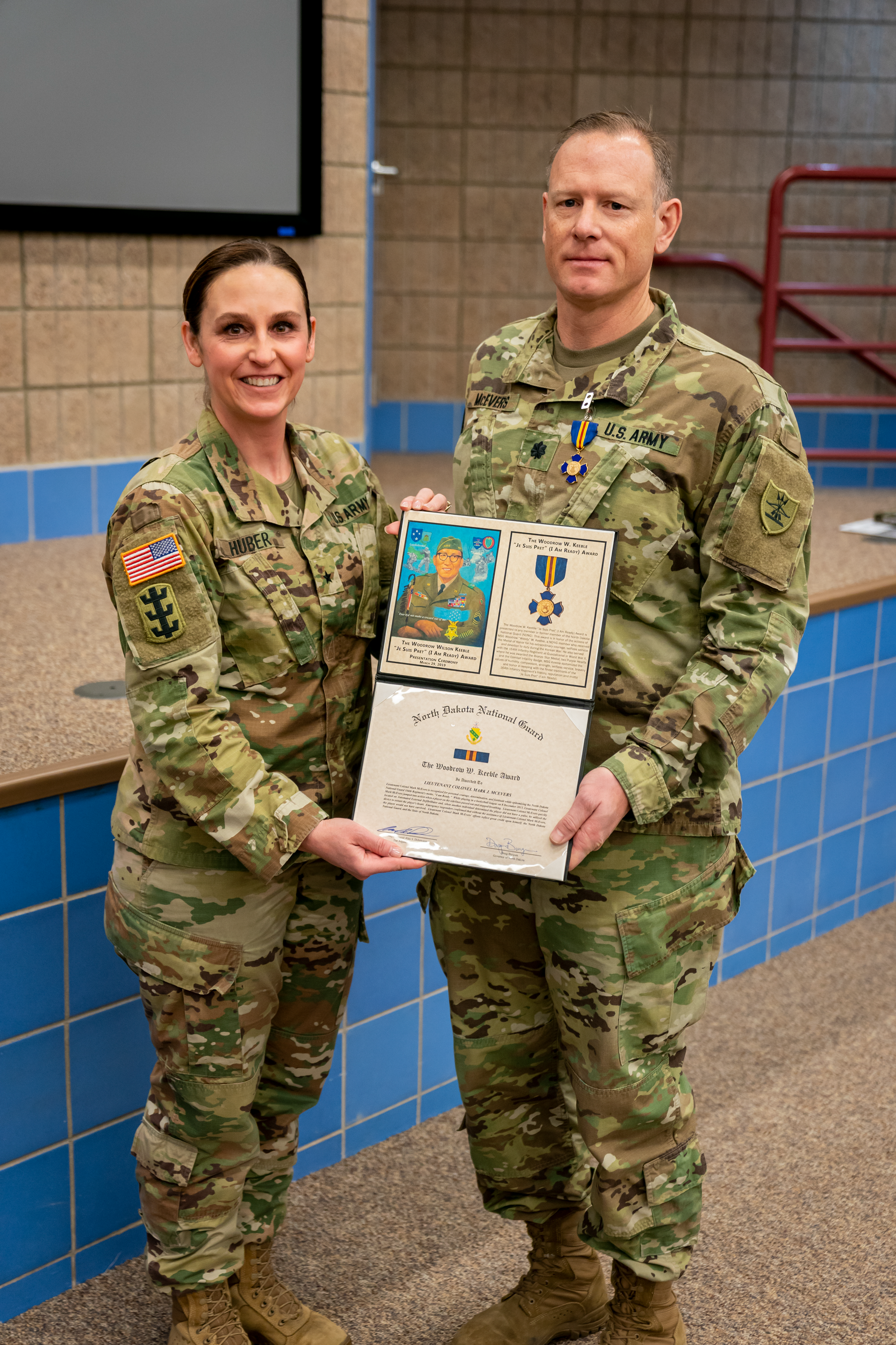 Brig. Gen. Jackie Huber, deputy adjutant, presented Lt. Col. Mark McEvers The Woodrow W. Keeble "Je Suis Pret" (I am Ready) Award on Jan. 11 during the Joint Force Headquarters drill in Bismarck. McEvers was recognized for saving a life at a recreational basketball league game in Jamestown in 2013 after a player collapsed and stopped breathing. McEvers efficiently employed an automated external defibrillator to help save the man's life.