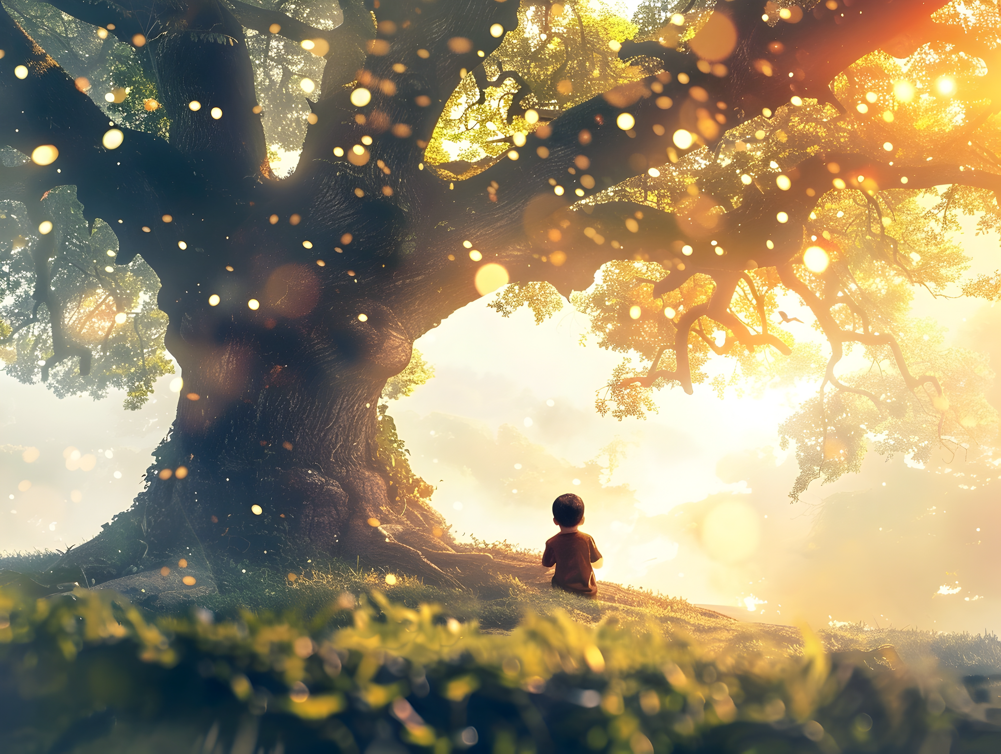 Creato con immagini di Aleksandra Konoplya - "Blurred overlay effect for photo and mockups. Wall texture with organic drop diagonal shadow and rays of light on a white wall. shadows for natural light effects" • jat306 - "Beam of light and the clouds" • Rattapol - "The sun light passes through the clouds after rain." • Bussakon - "A child listening to the whispered stories of an ancient massive tree in a serene magical landscape"
