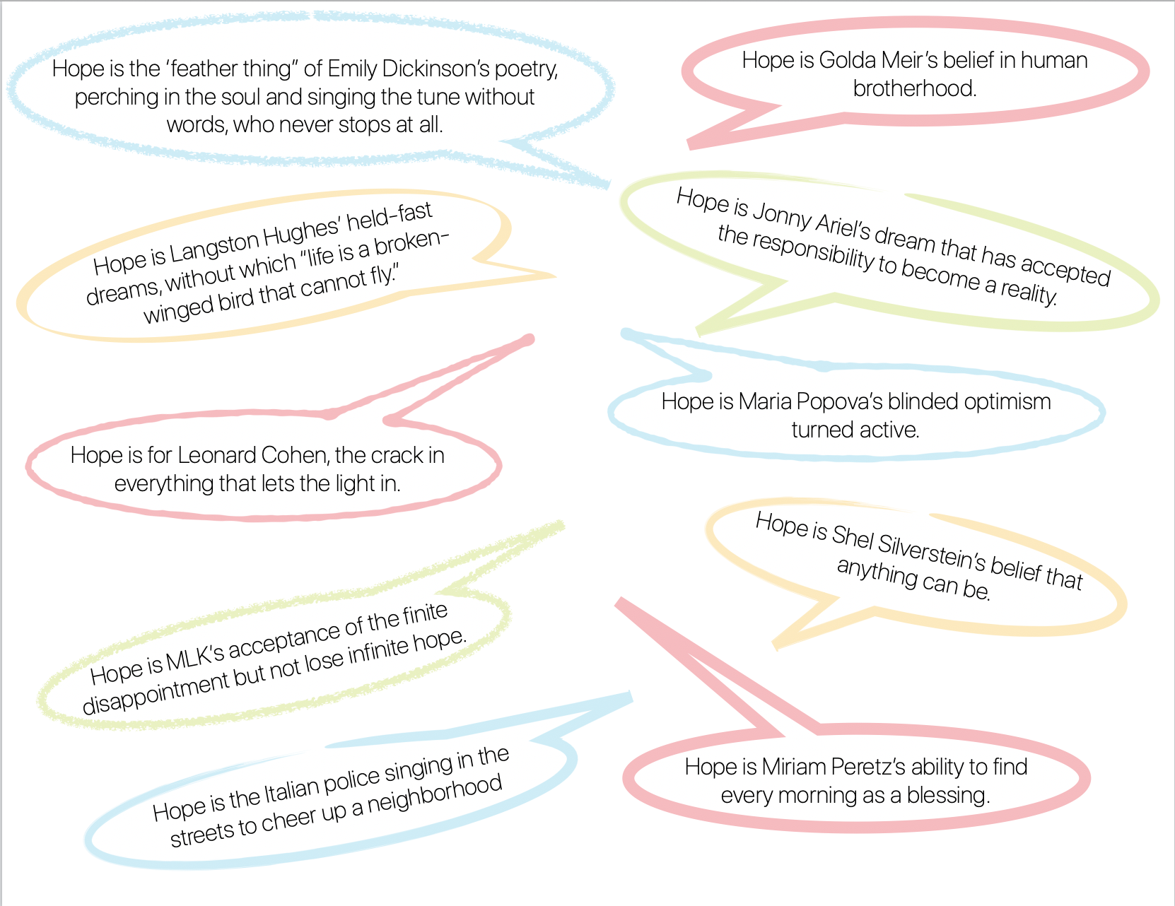 In this next exercise, we will create our own messages board of hope, our own wishing well. Please add a hope to this collective document. These messages can sustain us and cast positivity into the world.