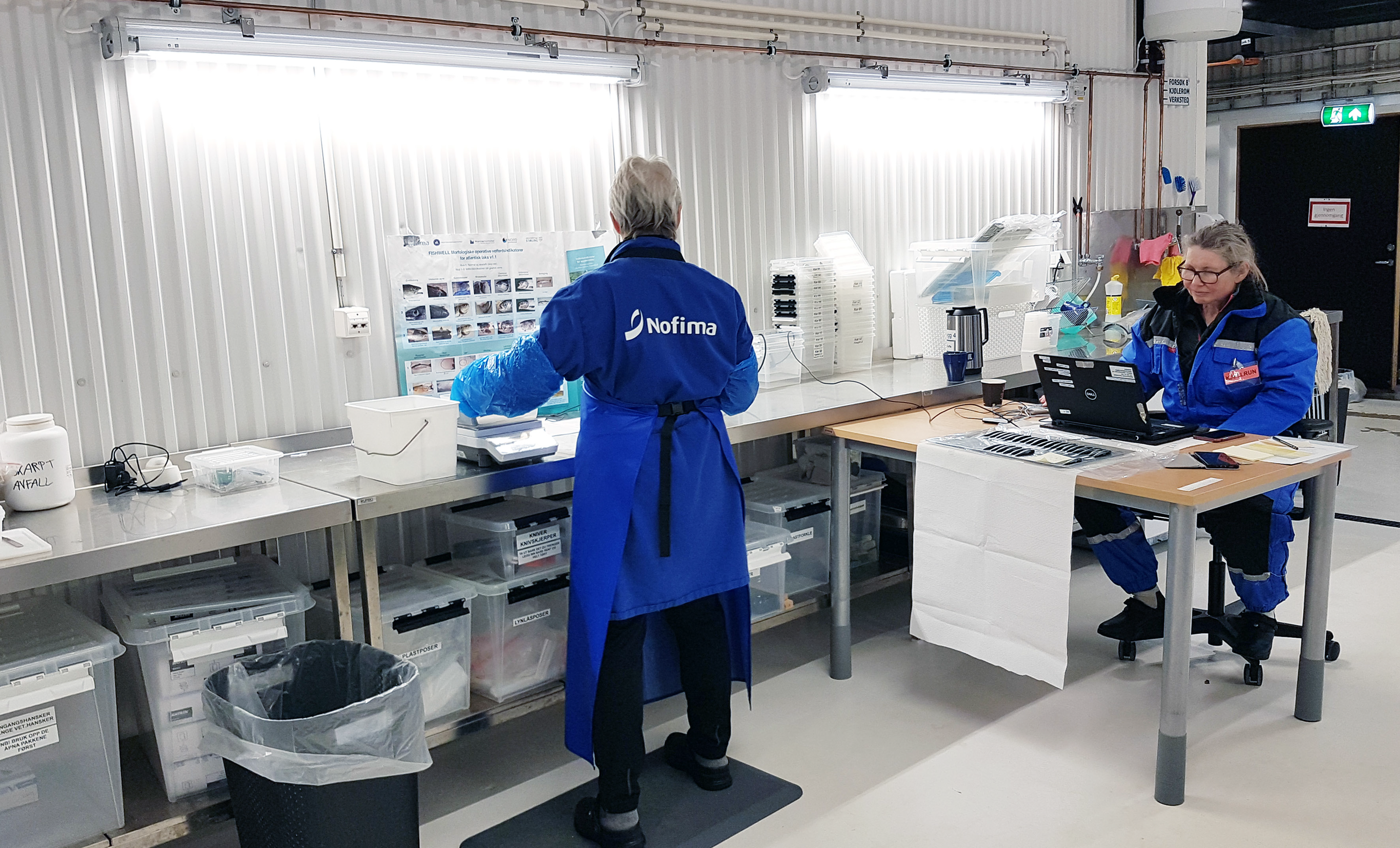 Gøril Iren Larsen og Kjellrun Hoås Gannestad registrerer vekt, lengde og velferdsindikatorer på lakseyngelen.