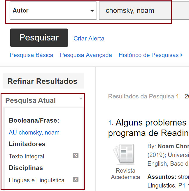 No menu lateral esquerdo "Refinar Resultados", encontra, em primeiro lugar a Pesquisa Atual: tipo de pesquisa, campo(s) e limitadores utilizados e outras opções ativadas antes de ter submetido a pesquisa.