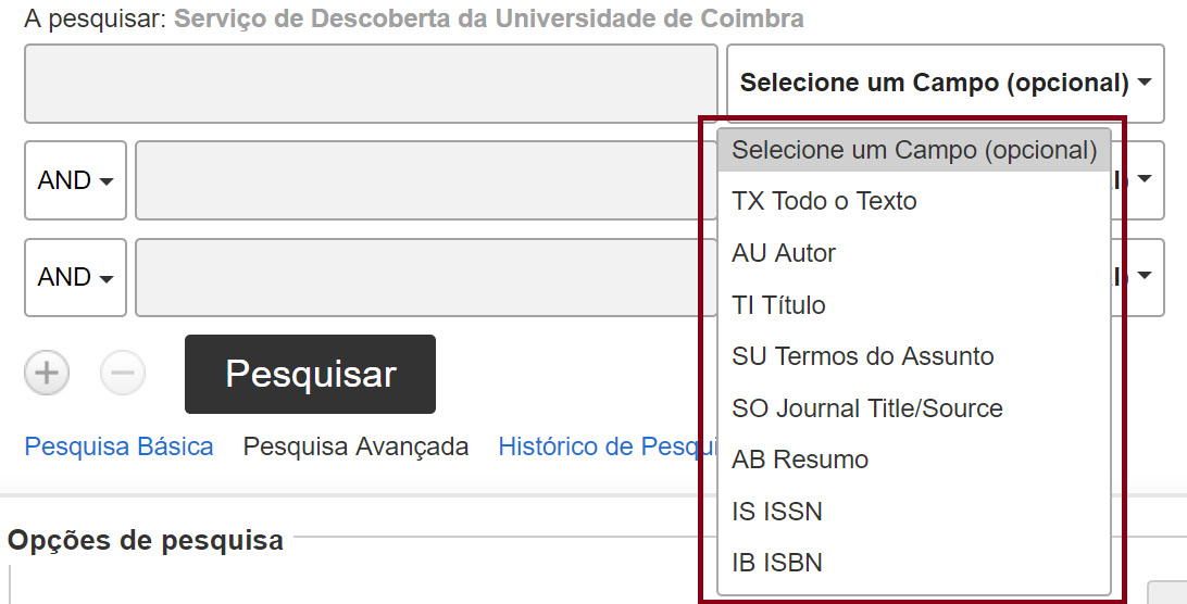 3. Na Pesquisa Básica pode ainda utilizar mais opções de pesquisa: