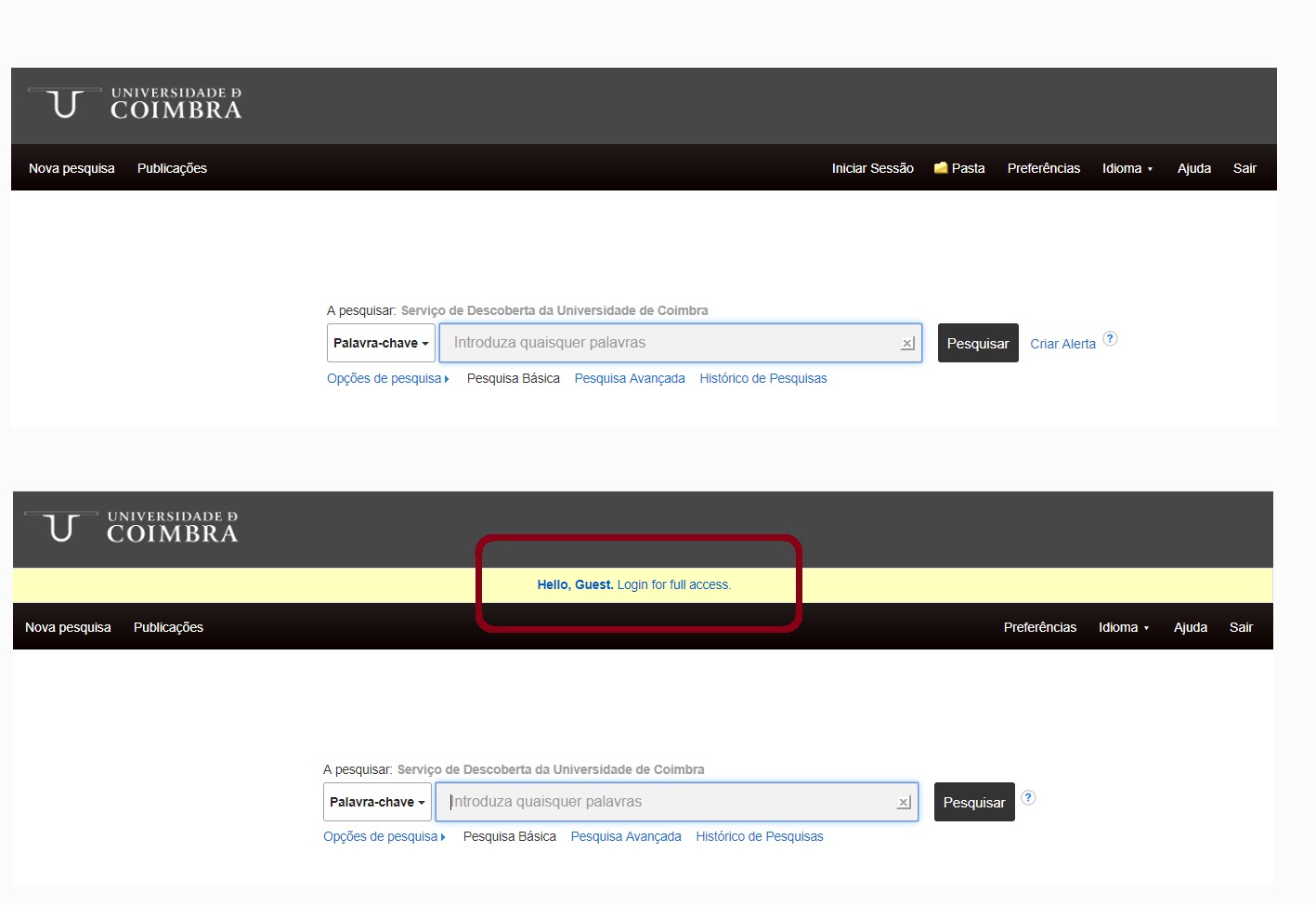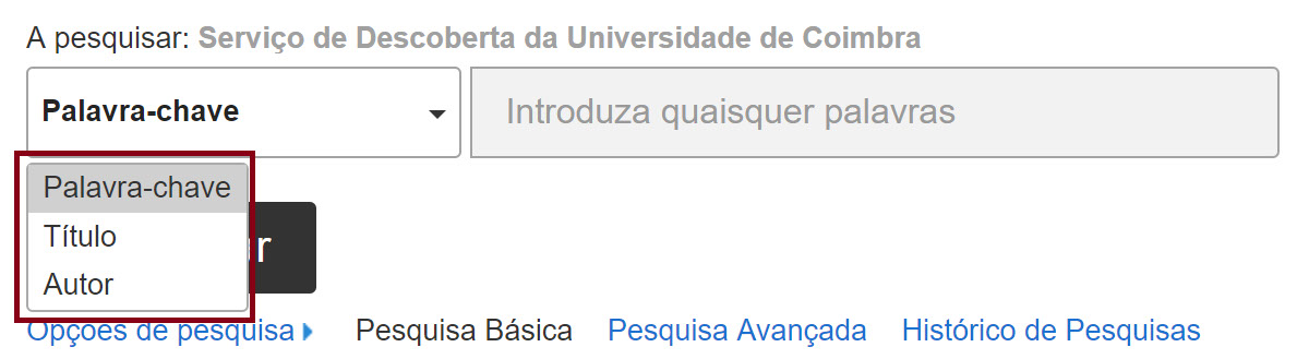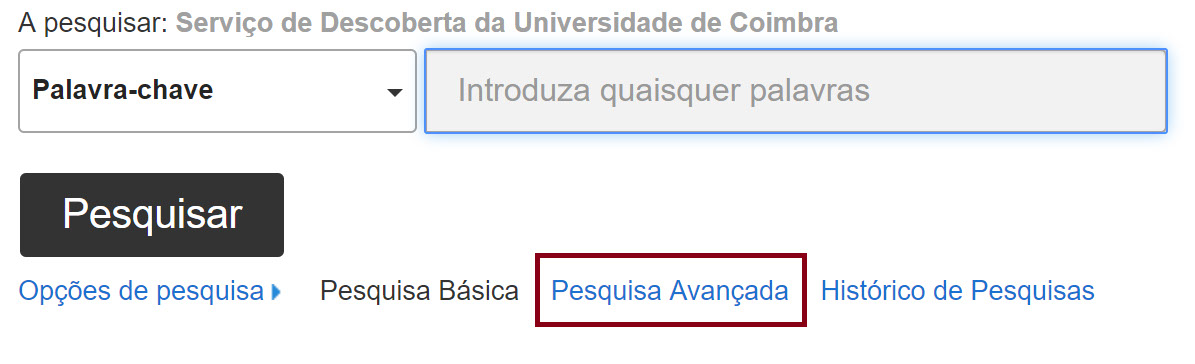 Na página principal dos Serviços Integrados das Bibliotecas da UC, clicando em Pesquisa Rápida. Será reencaminhado para a página do Serviço de Descoberta da UC