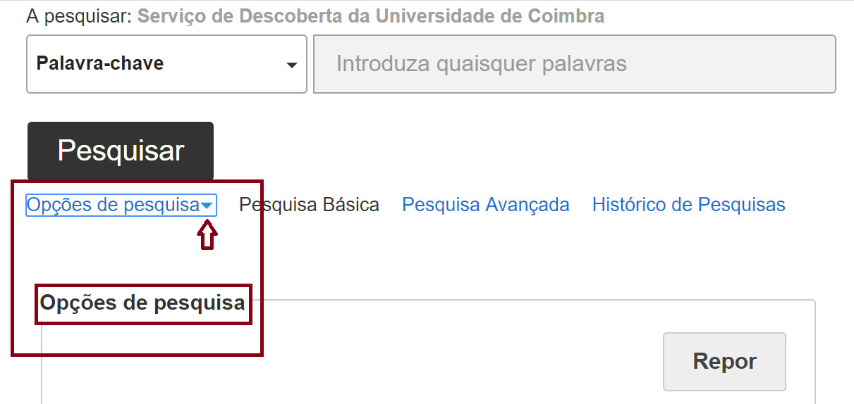 Na Pesquisa Avançada as "Opções de Pesquisa" são apresentadas por omissão, podendo usá-las antes de executar a pesquisa.