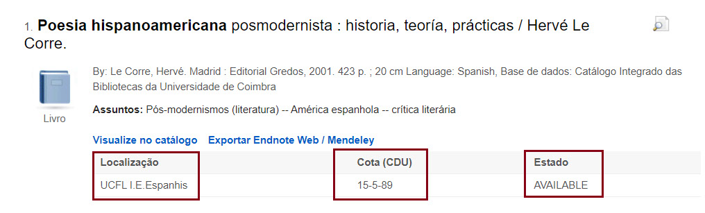 Pode ainda definir a biblioteca onde o recurso está integrado. Nos resultados são indicados: a localização física do recurso (biblioteca e cota) e a sua disponibilidade para consulta.