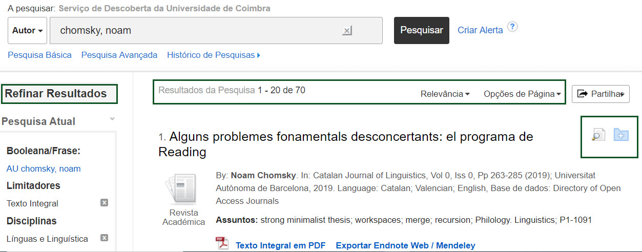 Por baixo da caixa de pesquisa, encontra o número de recursos encontrados [Resultados da Pesquisa], que podem ser ordenados por relevância ou cronologicamente.