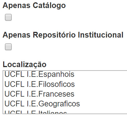 Pode também selecionar onde pretende fazer a consulta: catálogo (onde encontrará essencialmente recursos impressos), no repositório institucional, ou em ambos.