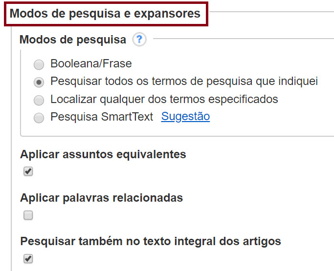 - a pesquisa Smartext [pode introduzir todo o texto de pesquisa que desejar: uma frase, uma expressão, um parágrafo ou até páginas completas. Este modo de pesquisa é restrito às bases de dados da EBSCO.]