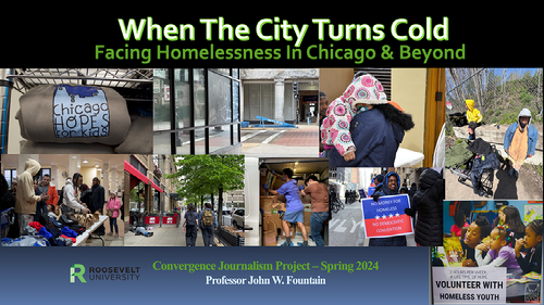 AGAINST THE BACKDROP OF the national migrant crisis, increasing poverty and the lingering misperception of homelessness in America as being mostly a portrait of indigent men, we examined homelessness in Chicago this spring semester. The objective for a team of Roosevelt University journalism students enrolled in the capstone multimedia project course over 15 weeks was to take a literary and microscopic look at homelessness during the most brutal months of the year here: Winter. Using the traditional approach of public affairs reporting, we took to the streets, where the homeless often dwell in the shadows of downtown skyscrapers on lower Wacker Drive on icy nights, in tent shelters in city parks, outside and inside police stations or beneath viaducts or downtown Chicago streets, where they cower beneath blankets in the darkened doorways of buildings in an effort to seek shelter from the wind.