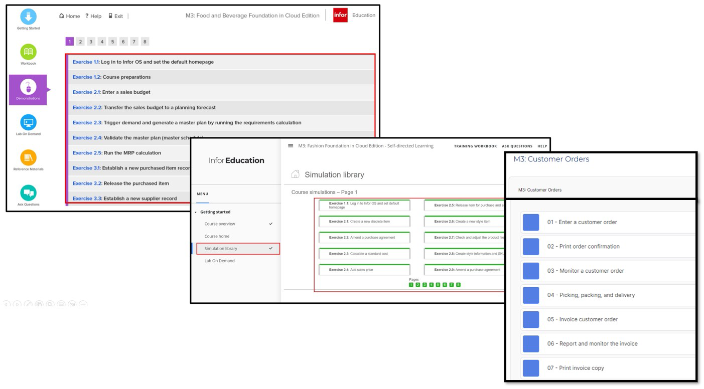 Examples of SDL - Exercises (M3: Food and Beverage Foundation in Cloud Edition & M3: Fashion Foundation in Cloud Edition) & eLearning - End User Simulations (M3: Customer Orders).