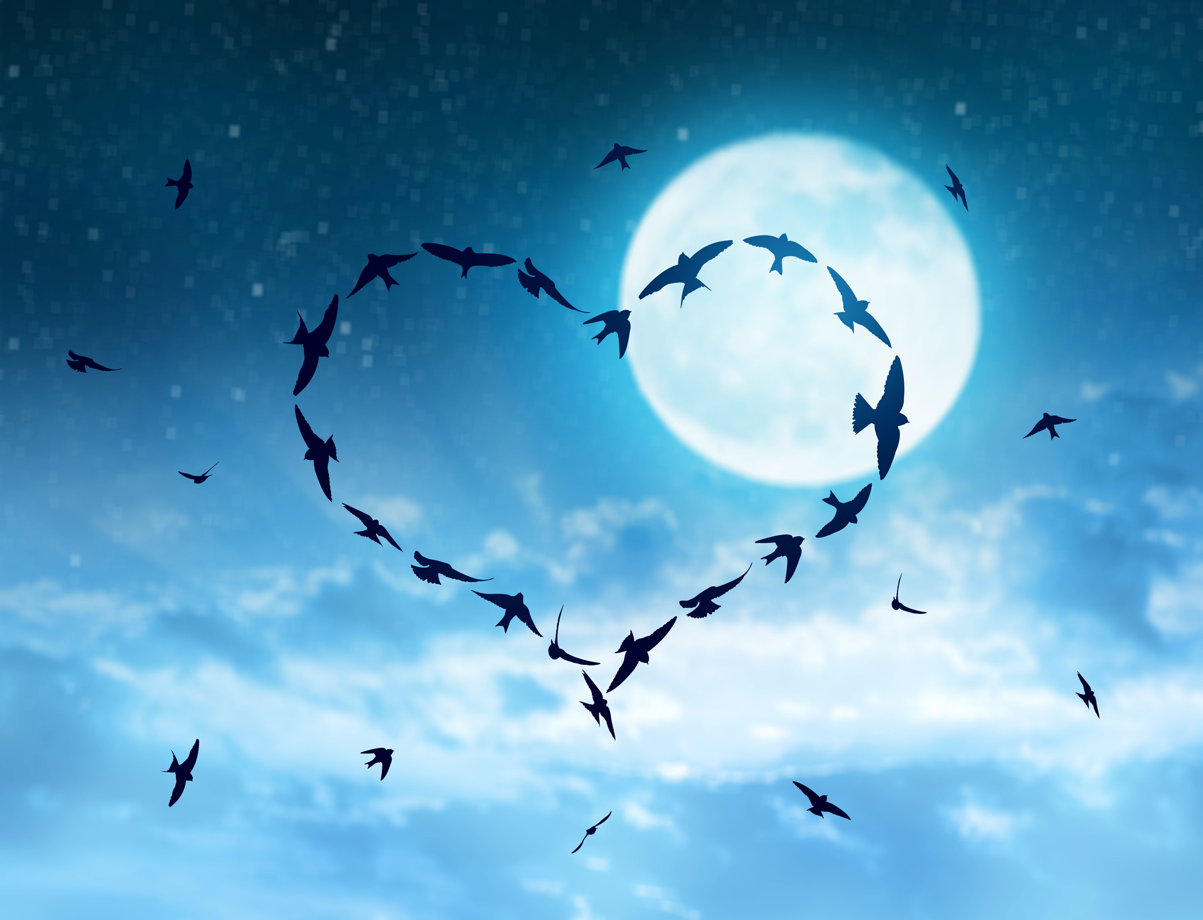 Created with images by vencav - "Flock of birds flying in the heart formation at night sky with full moon.,Happy Valentine's day." • Koonsiri - "Asian cheerleader team on green artificial turf." • SewcreamStudio - "Student and teacher hands holding red apple with chalkboard background, Happy teacher's day"