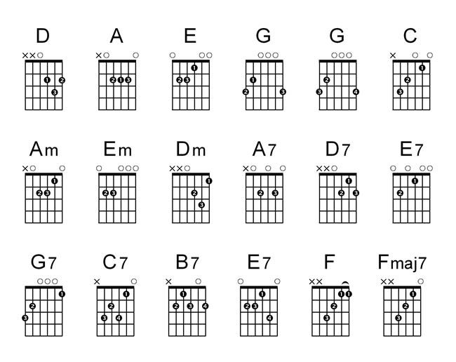 Als je je keuze hebt gemaakt, ga je dat refrein leren spelen op de piano of gitaar. Je ziet hieronder een schema met alle akkoorden van de gitaar (hoe je ze speelt) en van de akkoorden op de piano. Kijk vervolgens bij jouw liedje om te zien welke akkoorden je moet leren en in welke volgorde. Wanneer je ze kent, film je dat en neem je het geluid op.