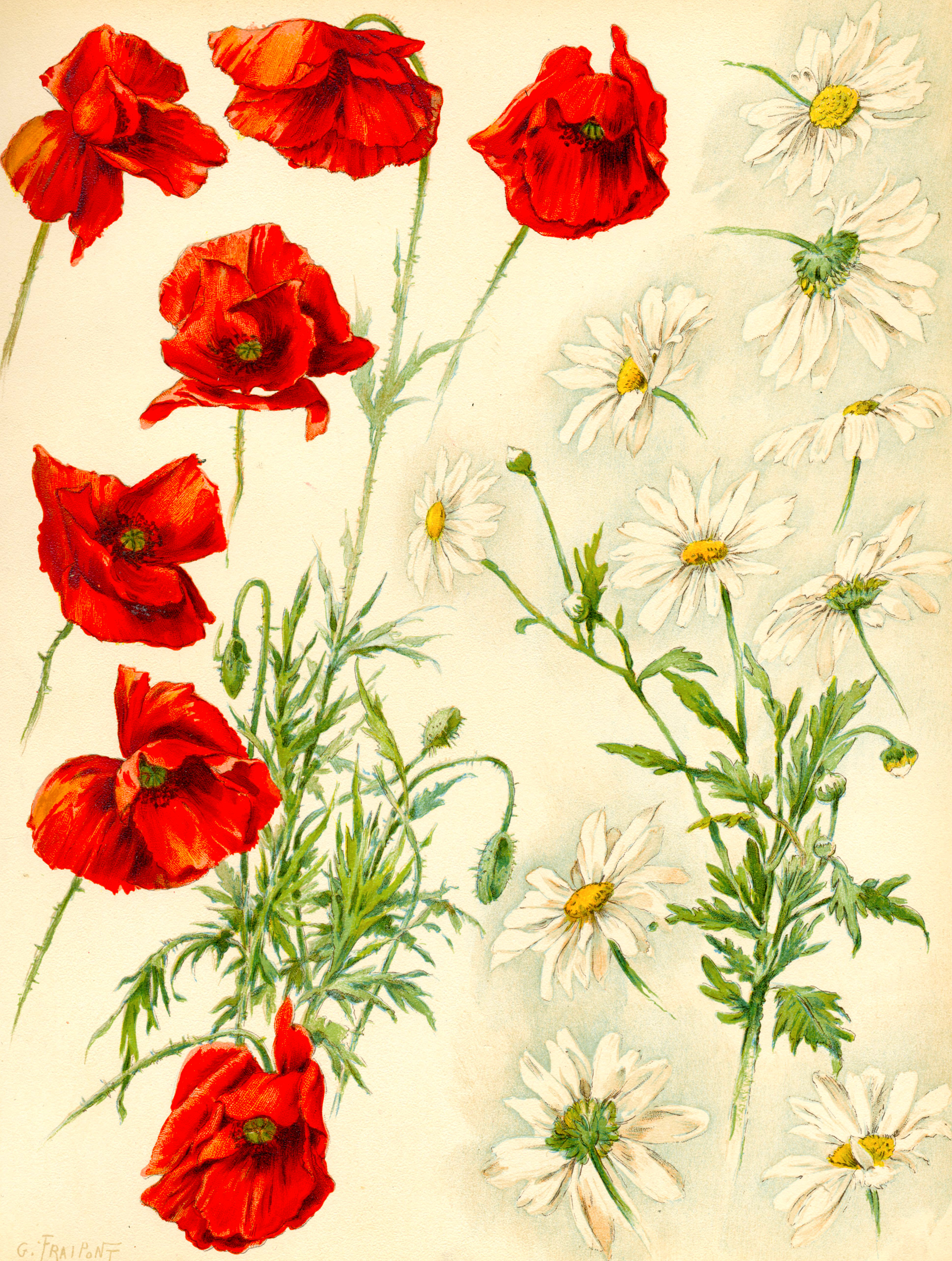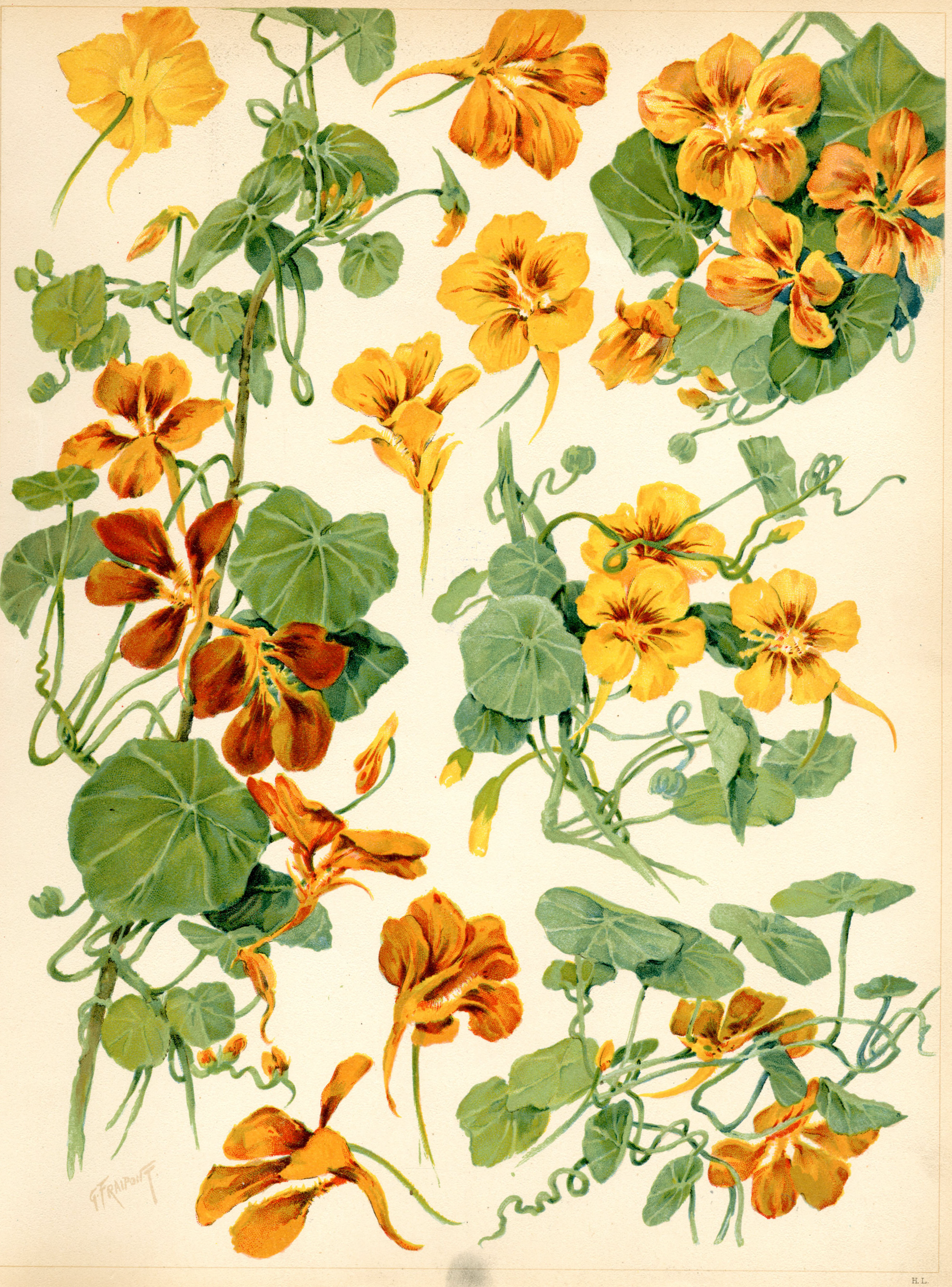 A droite, planche extraite de "La flore des artistes" : G. Fraipont ; Ed. Henri Laurens.